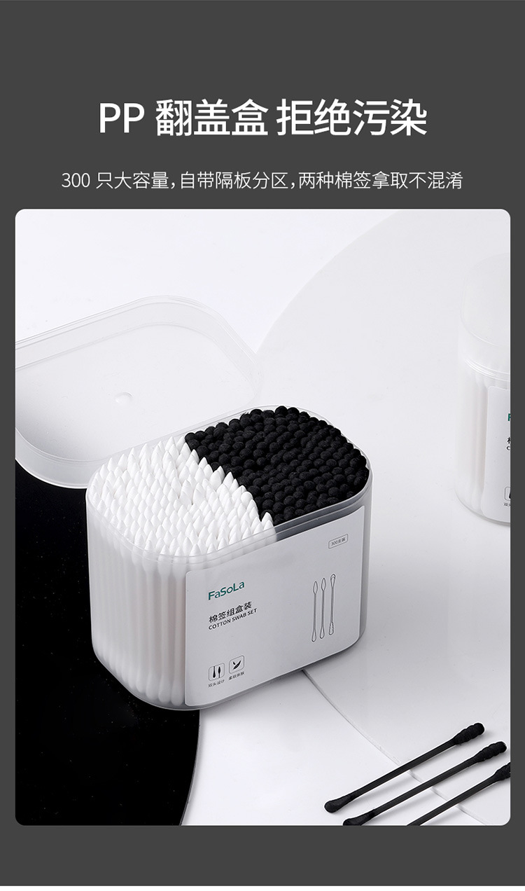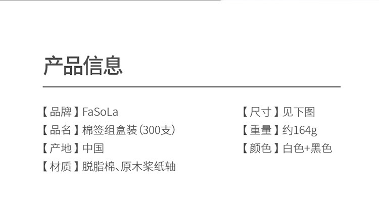 材质: 脱脂棉、原木桨纸轴 类型: 棉签 品牌: FaSoLa 片数: 300只 层数: 1 是否进口: 否 功能: 卸妆 颜色分类: 白+黑 货号: ZF-058 产地: 中国 包装数量: 300只 保质期: 4年 规格: 棉签组盒装(300支) 有可授权的自有品牌: 是 是否跨境出口专供货源: 是 装箱数量: 96 适用人群: 通用 重量: 0.3 kg/套