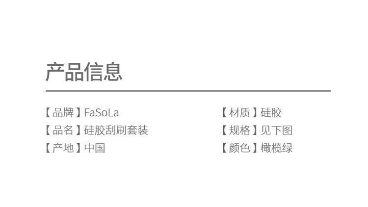 材质: 硅胶 品牌: FaSoLa 风格: 现代简约 货号: PS-295 是否进口: 否 产品上市时间: 2017年春 产地: 中国 规格: 硅胶刮刷套装 是否跨境出口专供货源: 否 颜色: 橄榄绿 是否有专利: 否 重量: 0.3 kg/套