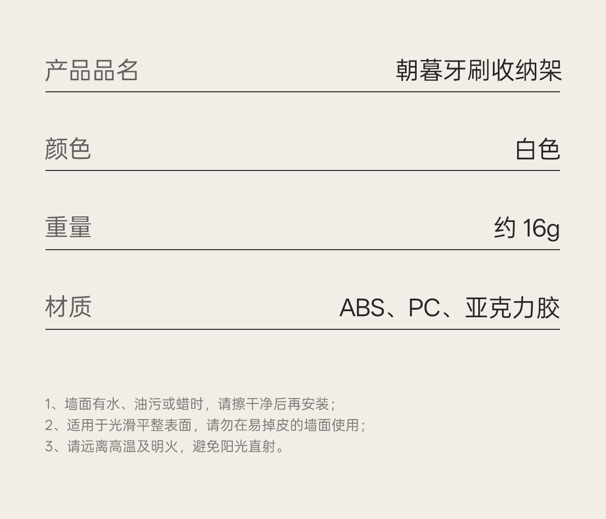 材质: ABS、PC、亚克力胶 功能: 免打孔 品牌: FaSoLa 箱装数量: 250 产品类别: 牙刷架 悬挂类型: 其他方式 是否进口: 否 货号: DZ-831 加印LOGO: 不可以 加工定制: 否 专利: 否 颜色: 白色 有可授权的自有品牌: 是 是否跨境出口专供货源: 是 重量: 0.3 kg/个