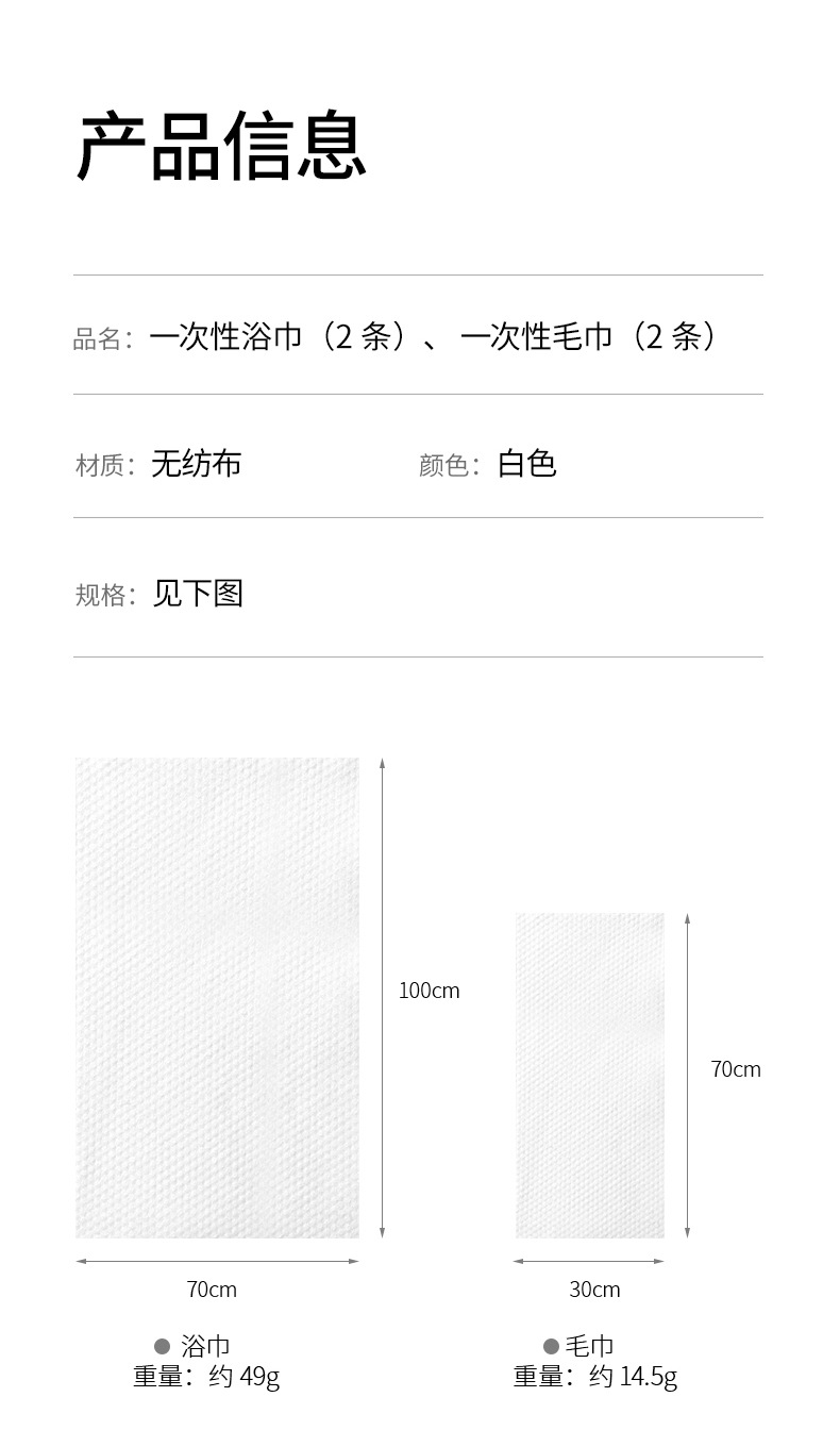 材质: 无纺布 品牌: FaSoLa 主成分: 棉 适用人群: 不限 吸水性: 5s-10s 制作工艺: 其他 货号: ZF-216 次成分: 纤维 加工定制: 否 颜色分类: 一次性浴巾(2条) 主要下游平台: 亚马逊,独立站,LAZADA 主要销售地区: 东南亚,东北亚,中东 是否跨境出口专供货源: 否 有可授权的自有品牌: 是 规格(长*宽cm): 70*100cm 重量: 0.3 kg/件