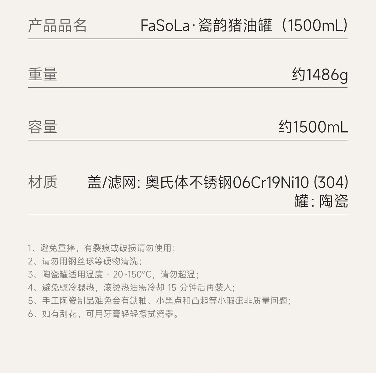 品牌: FaSoLa 形状: 圆形 容量: 1-2L 是否一次性: 否 产品质量等级: 合格品 是否进口: 否 货号: PS-840 产地: 中国 风格: 现代简约 加印LOGO: 不可以 贸易属性: 内贸 箱装数量: 8 产品上市时间: 2025 价格段: 50-60元 加工定制: 否 盒子层数: 1 是否有专利: 无 颜色: 米色猪油罐 有可授权的自有品牌: 是 是否跨境出口专供货源: 是 重量: 0.3 kg/个