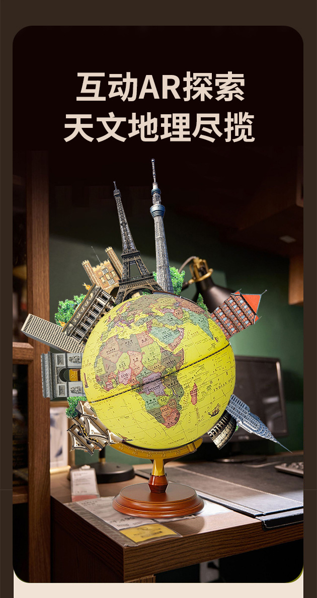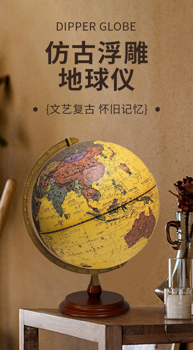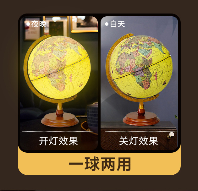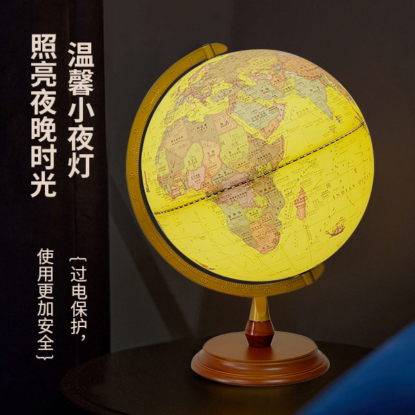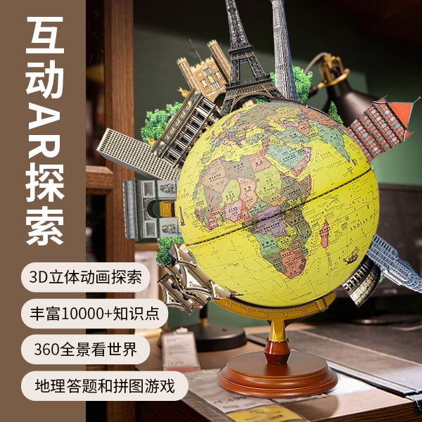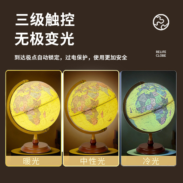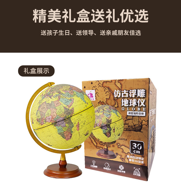 30CM高清仿古浮雕地球仪充电三色灯带AR功能送两张地图学生家用摆