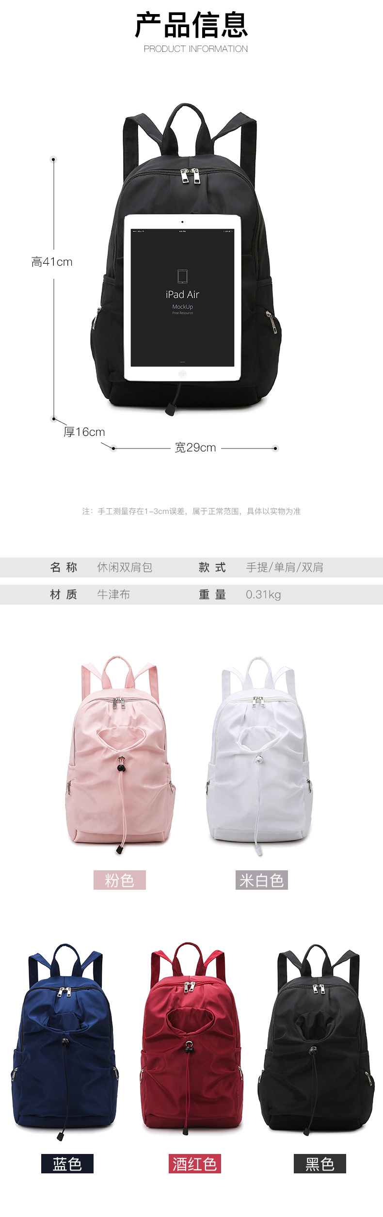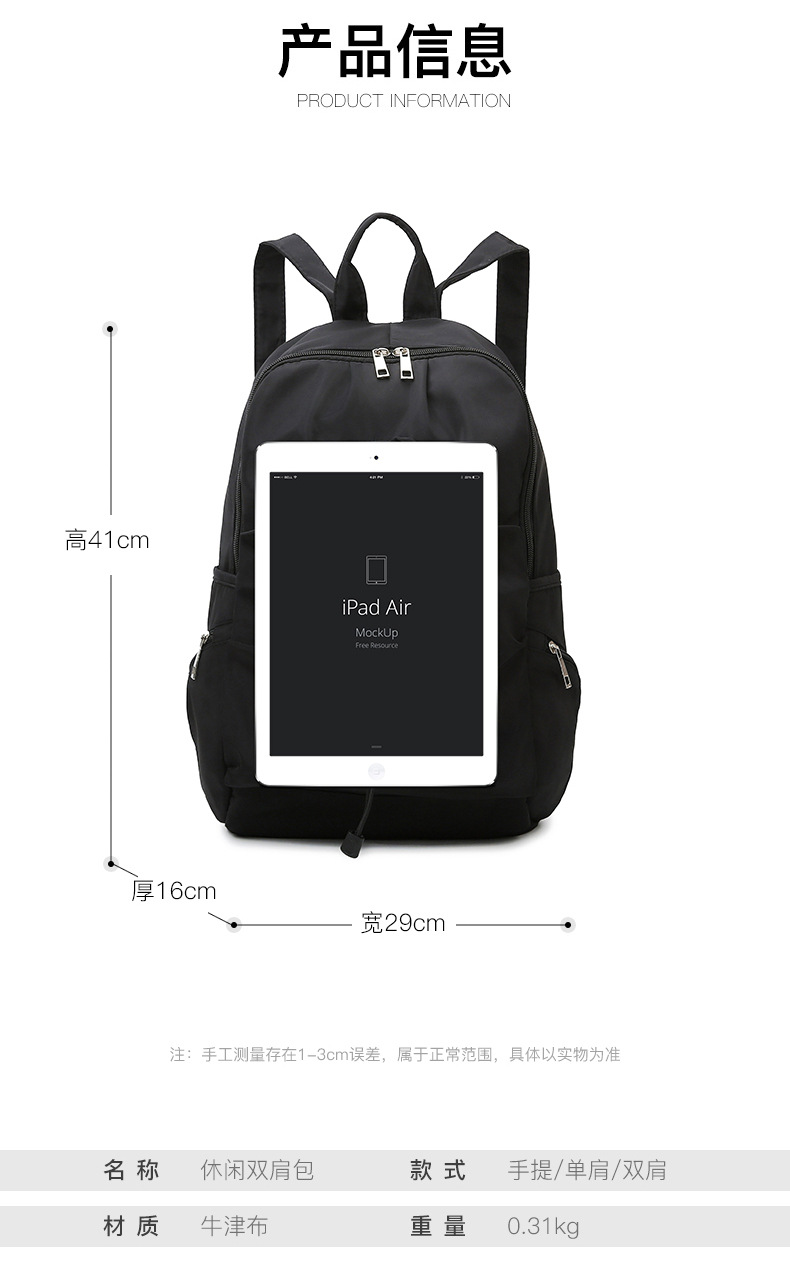 材质: 牛津布 功能: 透气 里料质地: 涤纶 皮质特征: 其它 容纳电脑尺寸: 14英寸 容量: 20-35L 适用性别: 中性/男女均可 品牌: 其他 颜色: 蓝色,白色 适用场景: 休闲旅行 风格: 都市简约 上市年份季节: 2023年冬季 货号: JK-J441 图案: 纯色 流行元素: 车缝线 背负系统: 弧形肩带 有可授权的自有品牌: 否 重量: 0.8 kg/个
