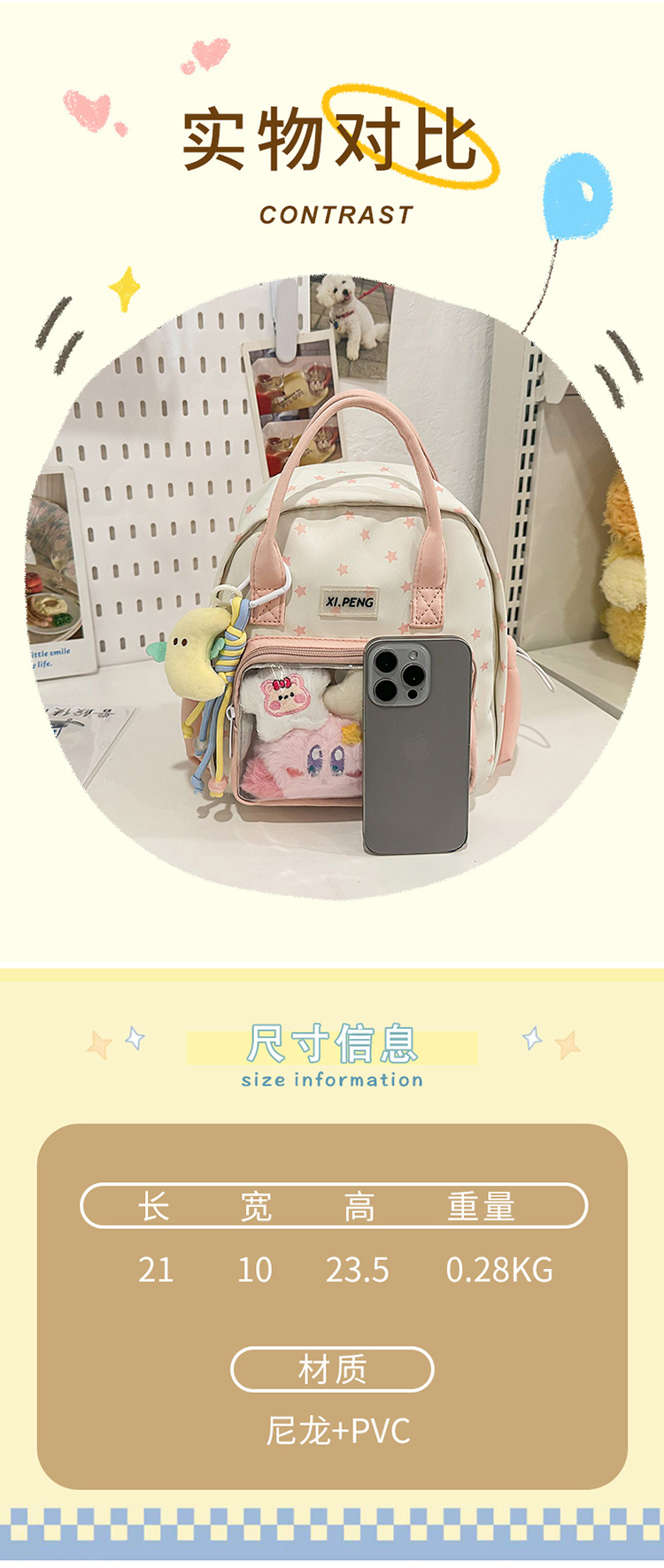 材质: 尼龙 功能: 透气 里料质地: 涤纶 容纳电脑尺寸: 9英寸 容量: 20L以下 适用性别: 中性/男女均可 品牌: 叹号熊 颜色: 蓝色,粉色,黄色,蓝色+玩偶+香蕉挂件, 适用场景: 学校教育 风格: 清新甜美 上市年份季节: 2025夏季 货号: XML9009 图案: 纯色 流行元素: 车缝线 背负系统: 弧形肩带 有可授权的自有品牌: 是 重量: 0.6 kg/个