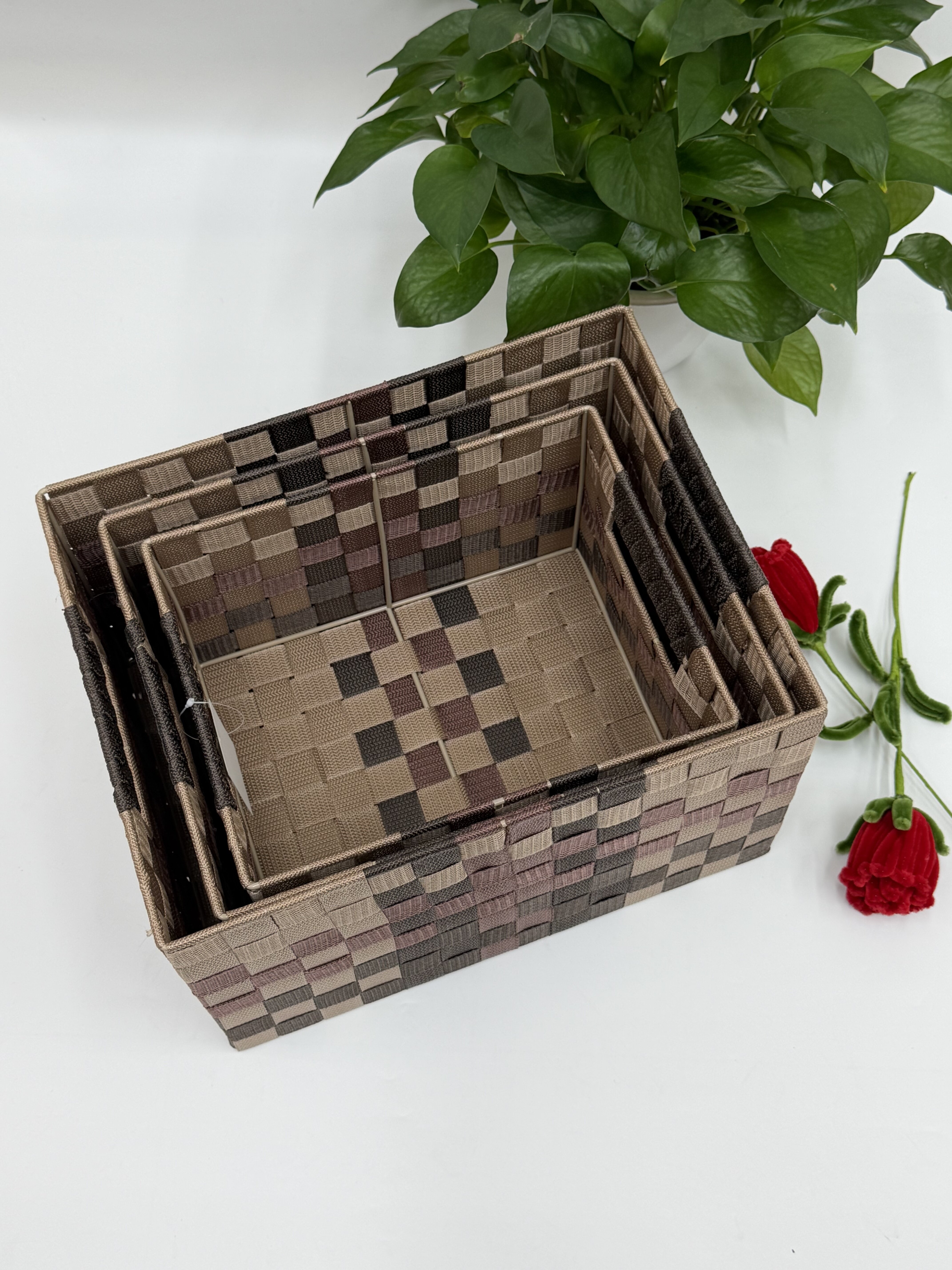 手工编织丙纶丝带收纳篮三件套