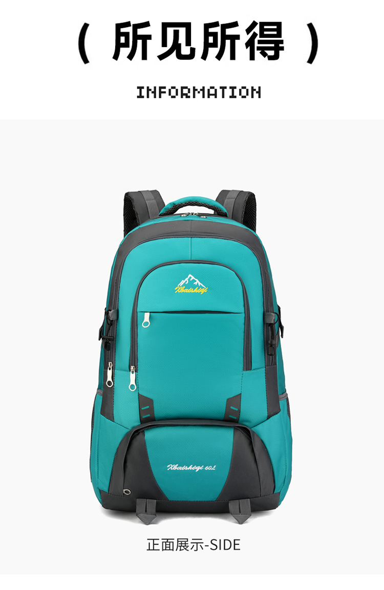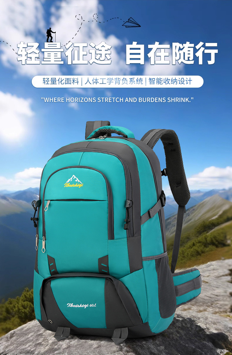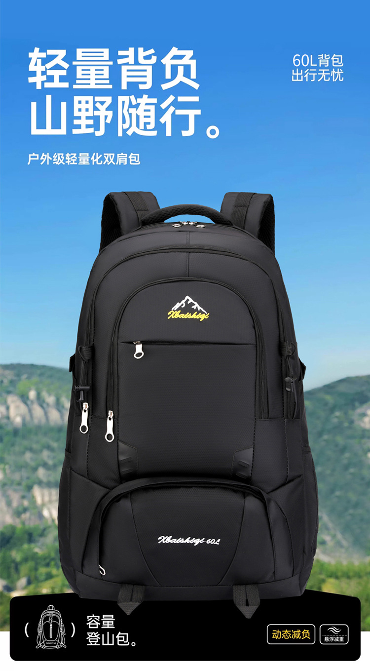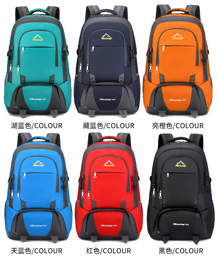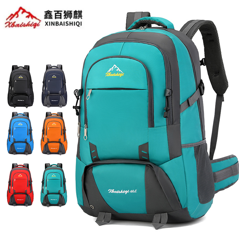 材质: 牛津布 功能: 防水,耐磨 里料质地: 涤纶 品牌: 鑫百狮麒 容量: 60升 背负系统: 气垫背带 适用场景: 户外运动 货号: 1768# 适用性别: 中性/男女均可 颜色: 黑色,红色,橘色,湖蓝色,深蓝色,天蓝色 上市年份季节: 2025年冬季 风格: 都市简约 图案: 字母