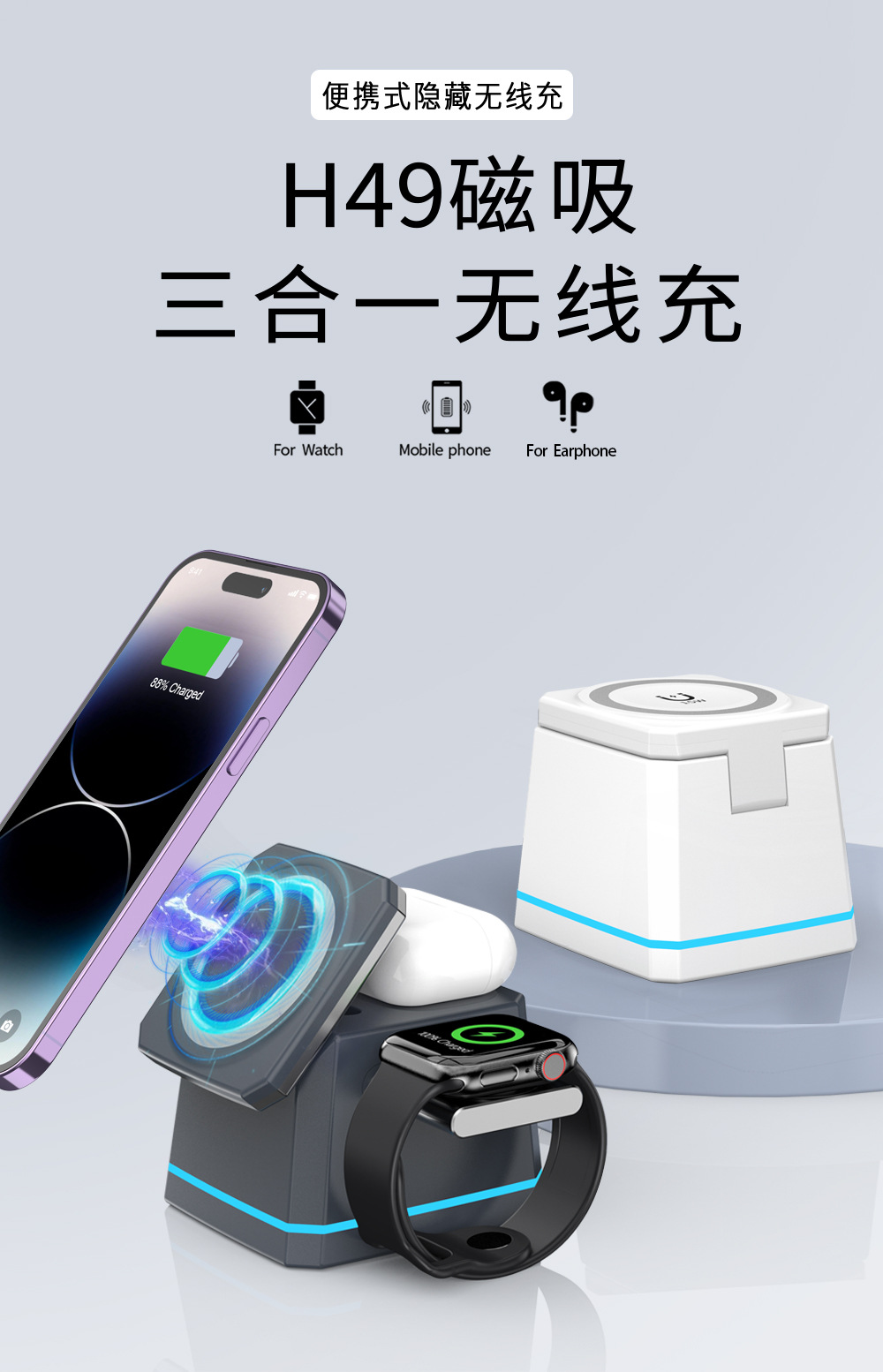 H49跨境新款适用苹果手机耳机手表magsafe磁吸透明三合一无线充电