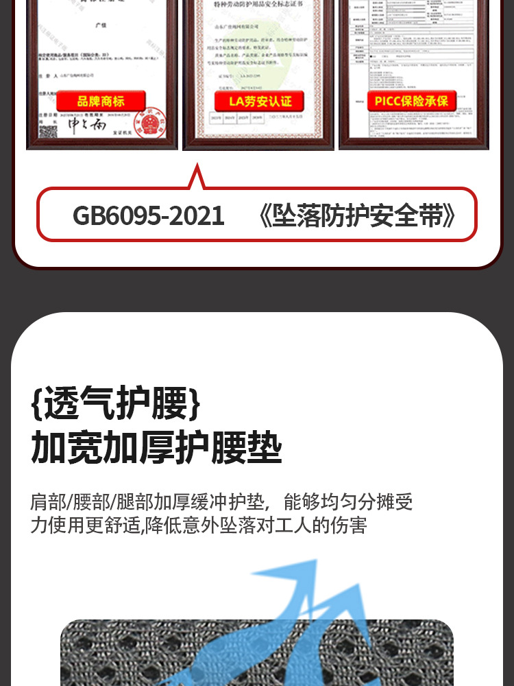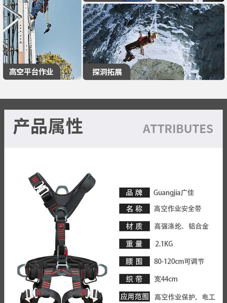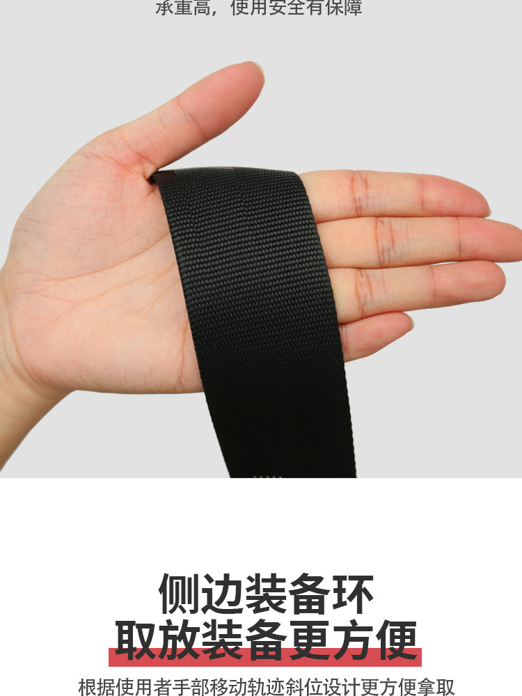 安全带材质: 涤纶 品牌: 广佳 安全绳材质: 涤纶 织带宽度: 45mm 绳长: 2米 颜色: 黑色 断破拉力: 25KN 标准编号: 国标GB6095-2021 单品货号: GJ-C8592 腰围: 80-120