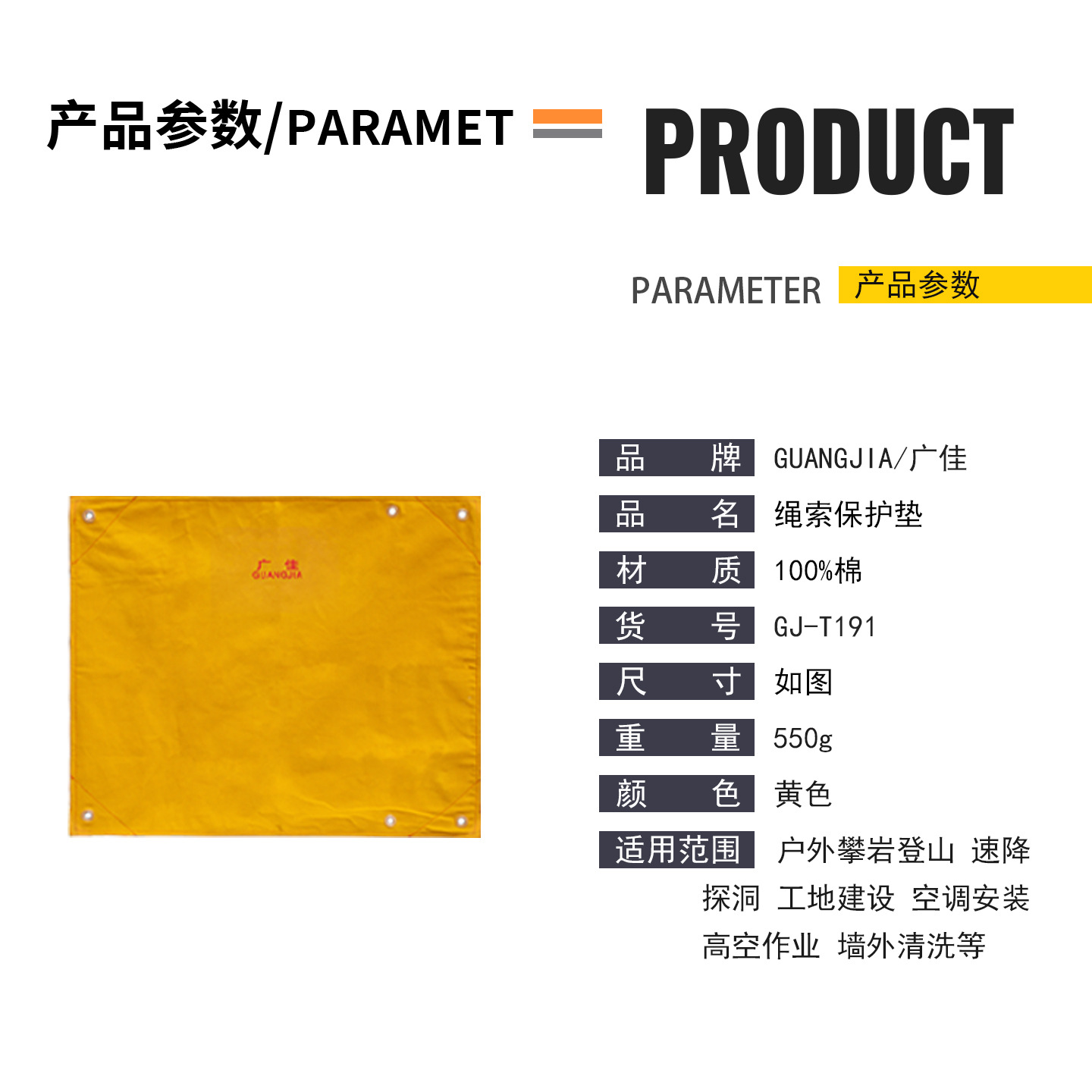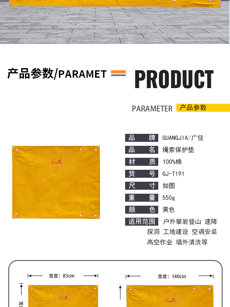 产品类别: 防磨垫 品牌: 广佳 规格: - 货号: GJ-A061 箱装数量: - 产地: 山东 是否跨境出口专供货源: 否 颜色: 黄色保绳垫69x83cm,黄色保绳垫14 专利类型: 无 外贸出口认证: -