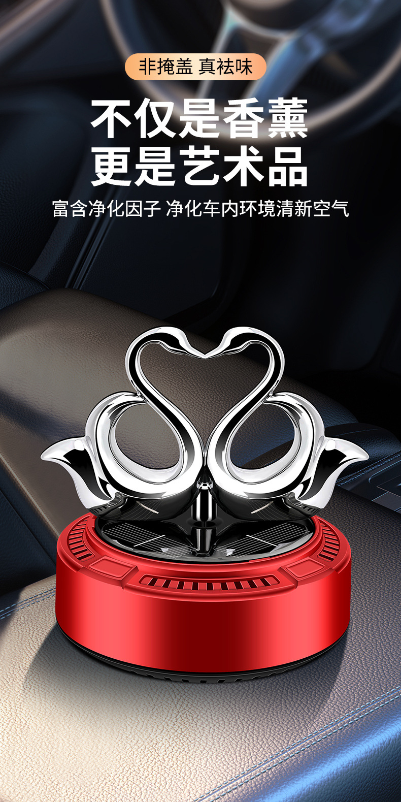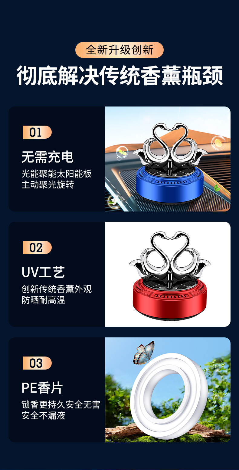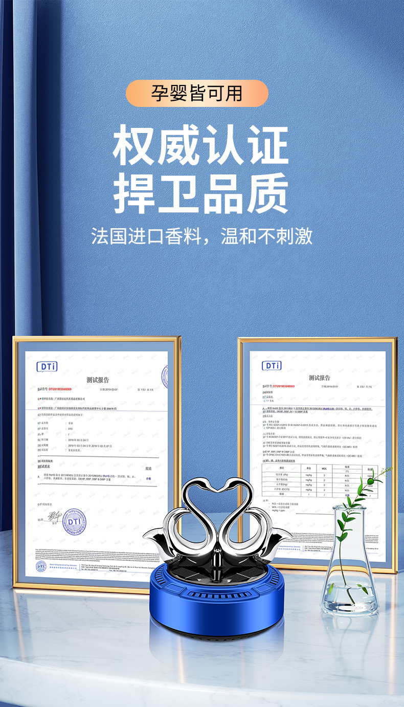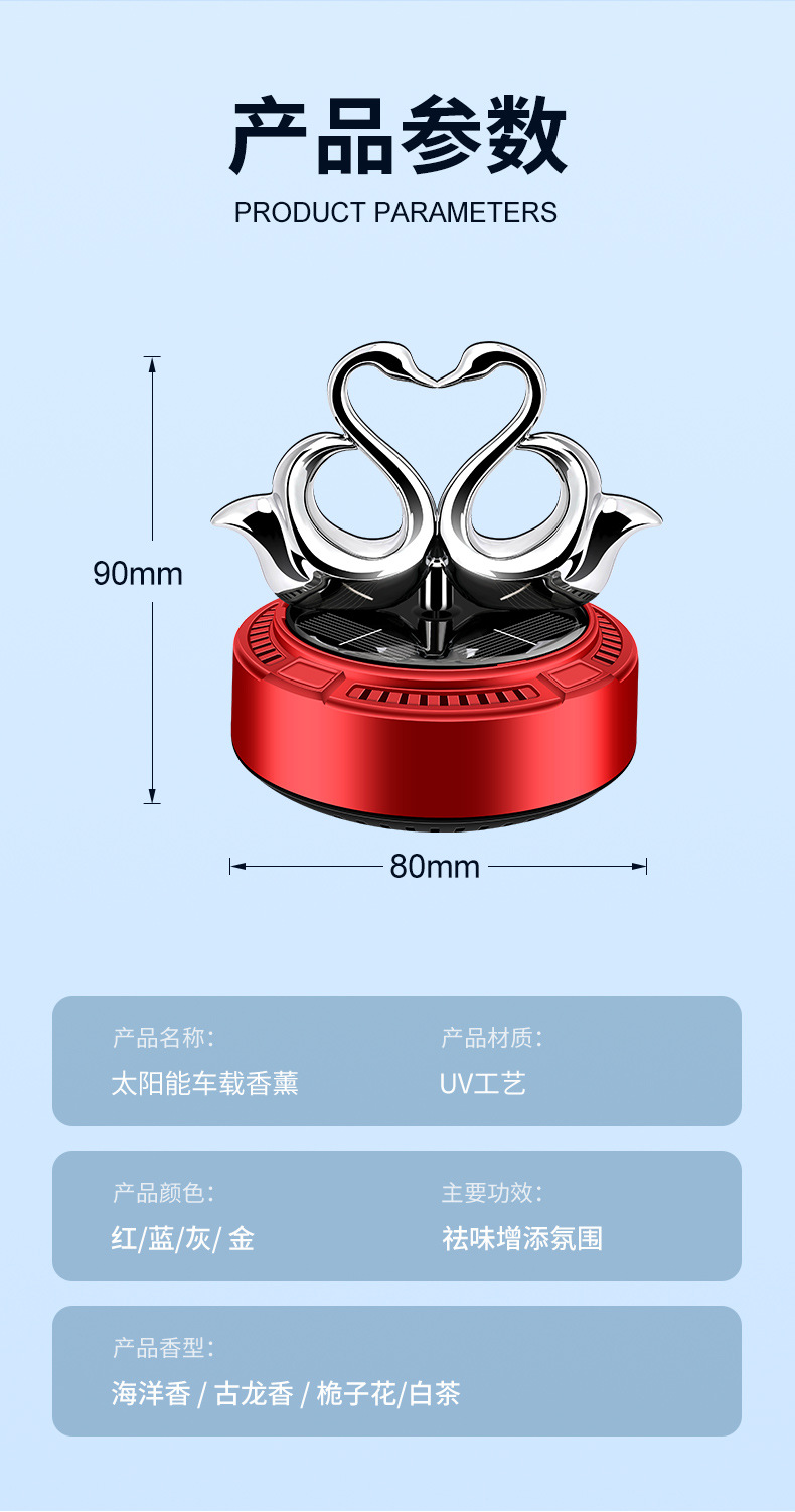 太阳能车载香薰汽车香水双天鹅自动旋转香氛除异味持久淡香摆件 English | 投诉