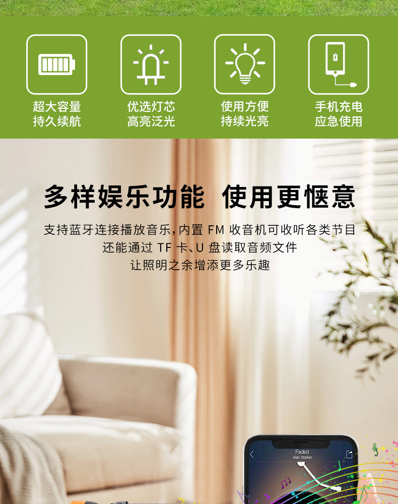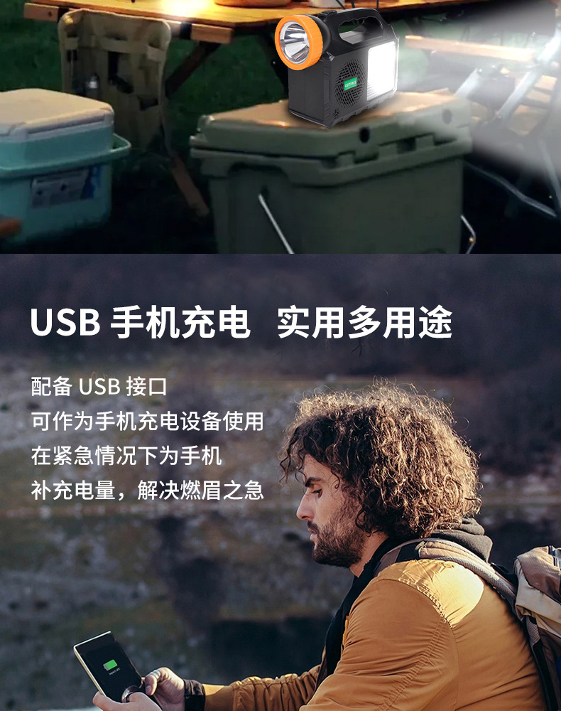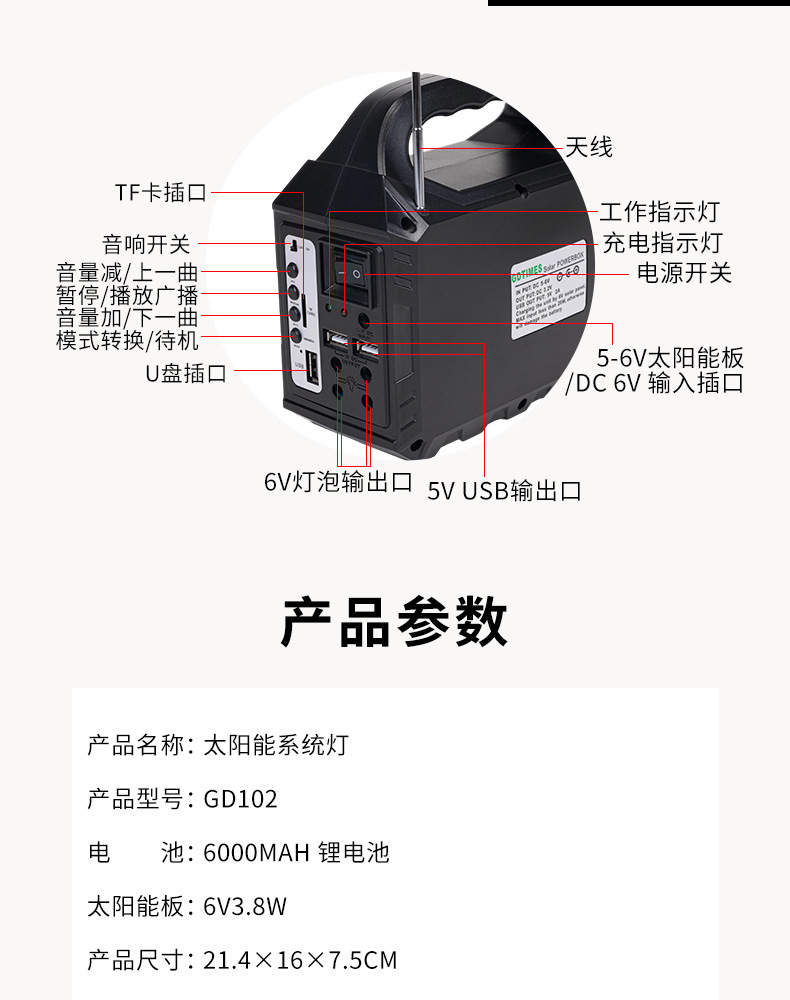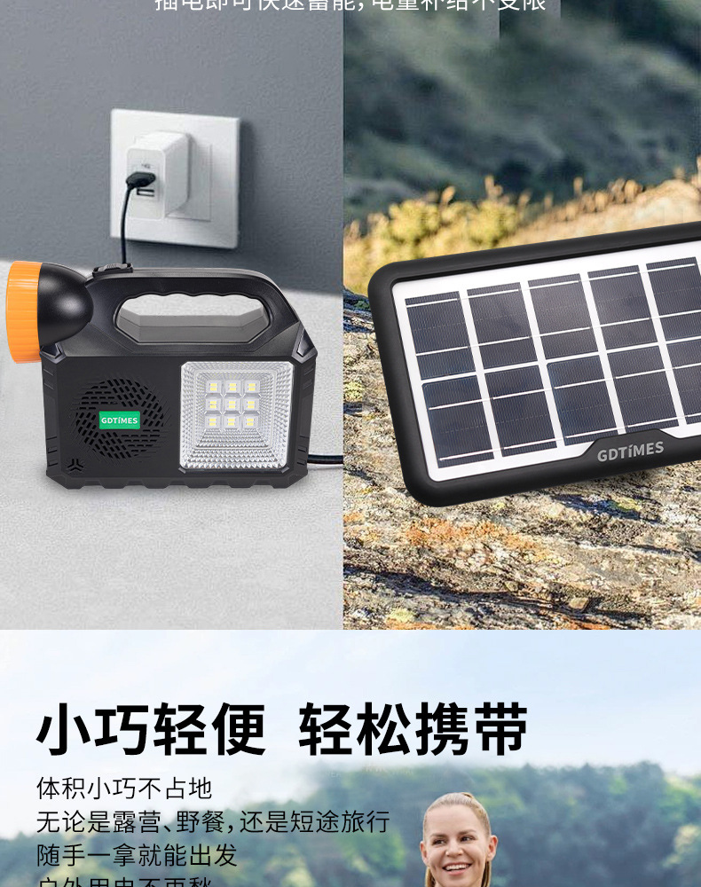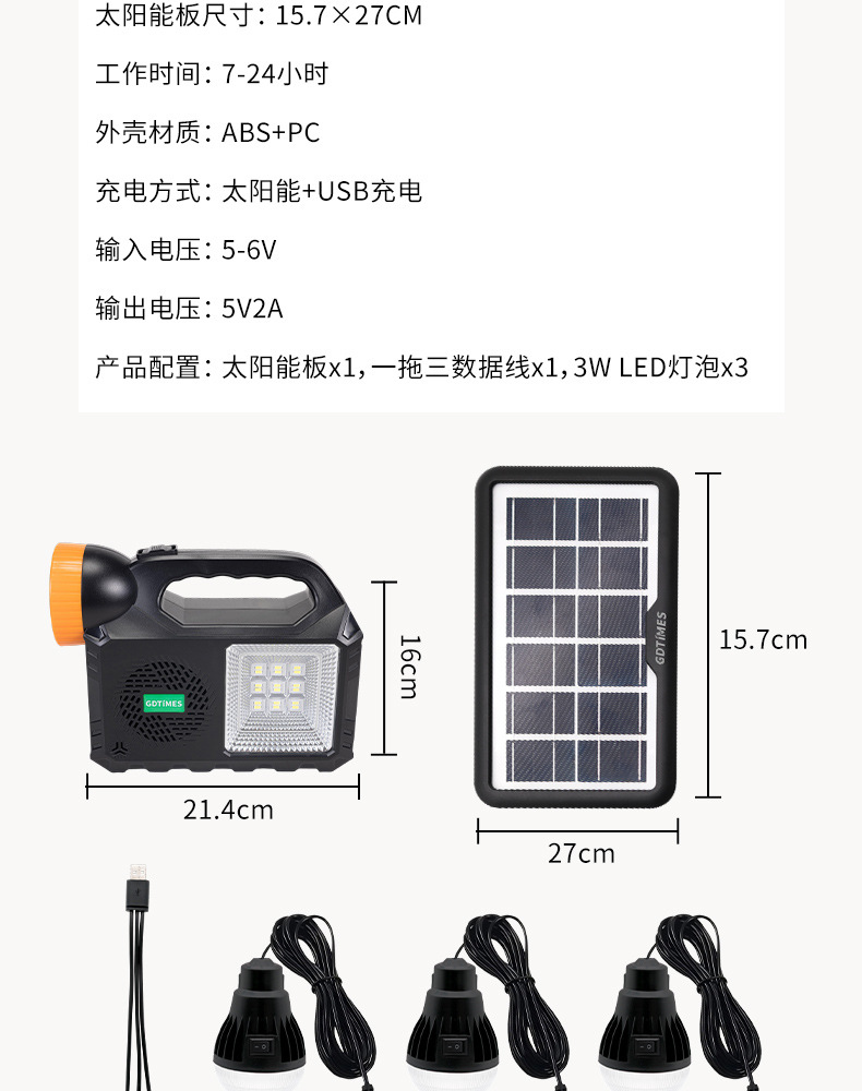 GD户外太阳能照明小系统露营庭院带灯泡可充手机 solar light音响 English | 投诉