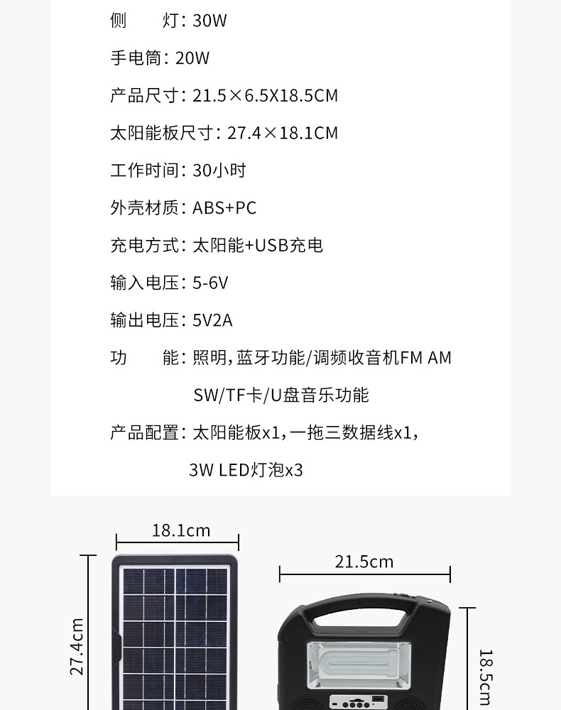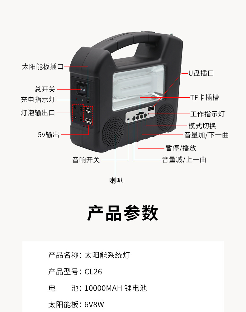 防护等级: IP65 开关类型: 手动 品牌: CCLAMP 光源类型: LED光源 连续照明时间: 24小时(含)-36小时(不含) 外形尺寸: 21X17X6.5CM 认证: 其它 额定功率: 30 产地: 浙江 是否进口: 否 货号: CL26 型号: CL26 规格分类: CL26 类型: 太阳能小系统 电压: 3.2 寿命: 0-3年(含) 主要下游平台: ebay,亚马逊,wish,速卖通,独立 主要销售地区: 非洲,中东,其他 有可授权的自有品牌: 是 是否跨境出口专供货源: 是