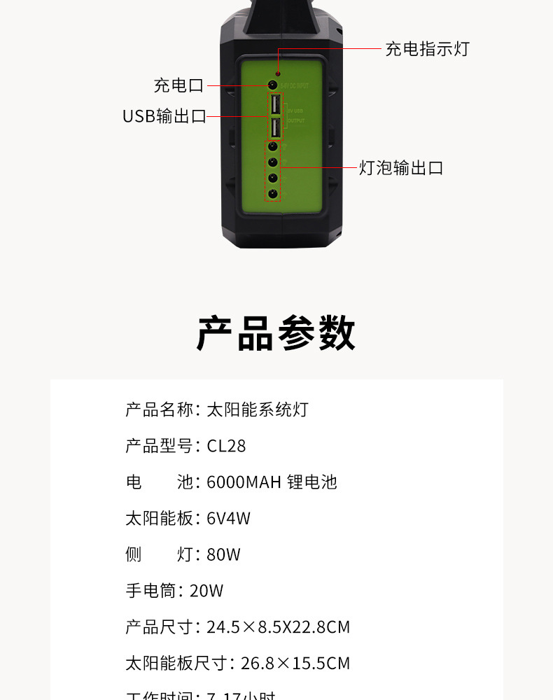 防护等级: IP65 开关类型: 手动 品牌: CCLAMP 光源类型: LED光源 连续照明时间: 12小时(含)-16小时(不含) 外形尺寸: 24.5X8.5X22.5CM 认证: 其它 额定功率: 80 产地: 浙江 是否进口: 否 货号: CL28 型号: CL28 规格分类: CL28 类型: 太阳能小系统 电压: 3.2 寿命: 0-3年(含) 主要下游平台: ebay,亚马逊,wish,速卖通,独立 主要销售地区: 非洲,中东,其他 有可授权的自有品牌: 是 是否跨境出口专供货源: 是