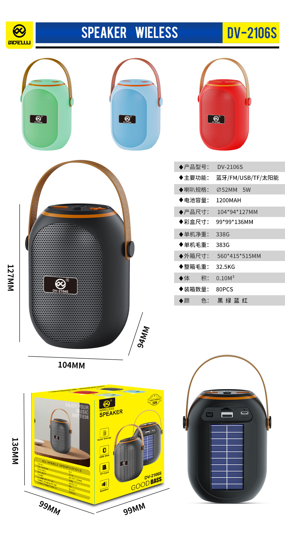 主要功能:5.3蓝牙+FM收音机+U盘播放+TF卡播放+太阳能