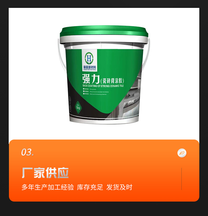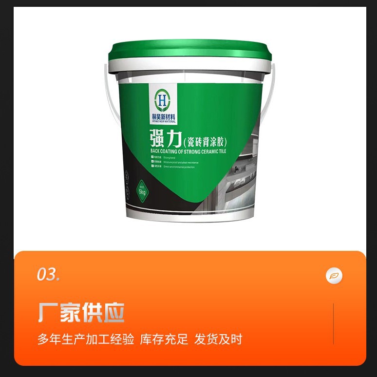 防水弹性乳液JS防水弹性乳液是一种柔软、自交联型的丙烯酸乳液,涂膜具有极好的防水耐碱性能,与水泥和料粉具有良好的相容性,并具有优良的低温性能、延伸性、抗张强度及韧度。JS防水弹性乳液可用于配制高性能水基型弹性腻子、屋面防水涂料以及弹性的中间涂料。 典型特性:聚合物类型 自交联丙烯酸酯共聚型 外观:乳状白色乳液 PH值(25℃)7~8 布氏粘度(25℃,3号转子,60转/分)200~2800cps 固含量54±1% 最低成膜温度0℃ 玻璃化转变温度-8℃ 甲醛含量<100ppM 防水用于聚合物水泥防水浆料的参考配方 1型(普通型KII)高温季节型: 基础配方 液体:乳液加水1.5倍的水混合 杀菌方剂眯加入水量的1% 粉料: 白水泥P42.5 普通硅酸盐水泥 300 重钙400目 300 石英砂(80-120目) 400 HEC (3万) 1.0 减水剂 适量 液体 粉料=1:3 成品一吨(1000KG)配方 乳液 100 水 150 杀菌剂 0-1.5 白水泥 225 重钙400目 225 石英砂(80-120目) 300 HEC (3万) 0.75 减水剂 造量 合计 1000 配方使用的环境要求:可在夏季或高温季节使用,五月--九月份使用,使用时材料及环境温度在50℃附近。 配方应用参数成本:1.2Kg,固含量:55% 比重:1920.4Kg/每立方米