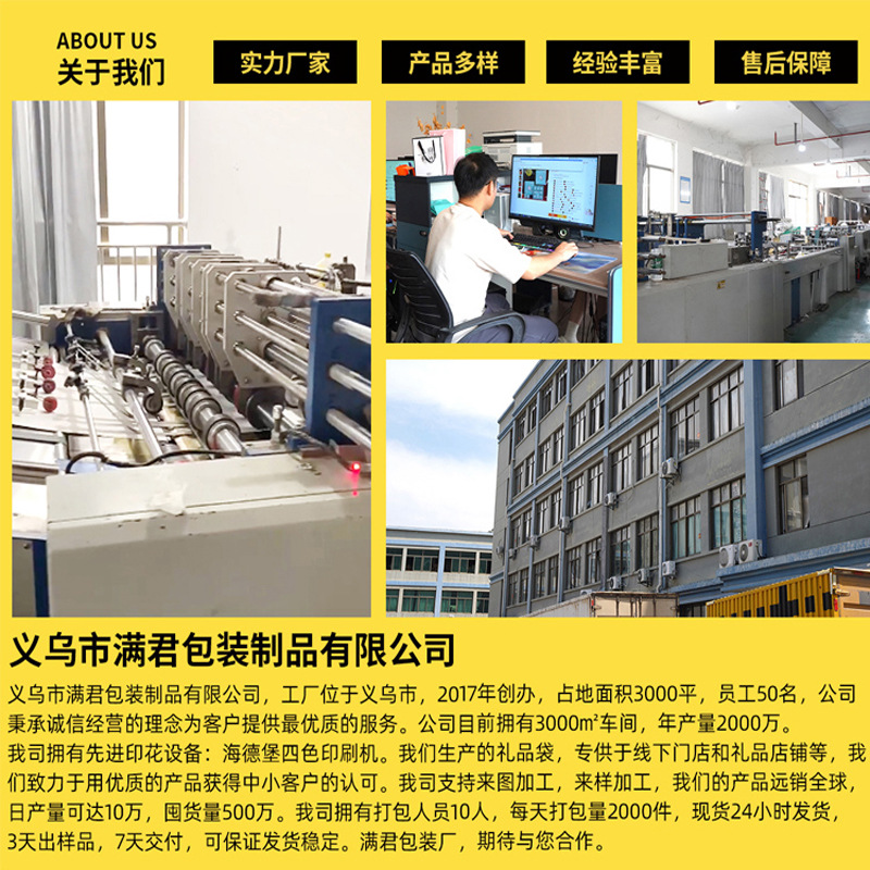 品牌: 满君 是否跨境出口专供货源: 是 风格: 商务 货号: 038 原产国/地区: 中国 适用送礼场合: 海产品礼品袋 日生产量: 10万 产地: 义乌 供货类型: 现货尺寸+可定制 加印LOGO: 可以 工艺: 烫金 规格: 11.5*9*35.5cm单 颜色: 白色黑边 材质: 白卡纸 重量: 0.04 kg/个