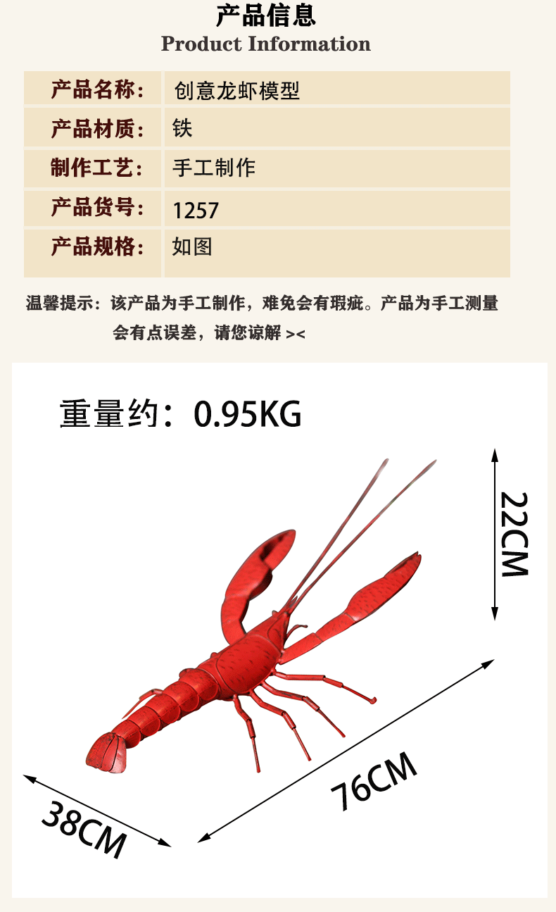 仿真大号龙虾模型挂件手工铁艺海鲜店餐厅商铺创意家居装饰品摆件 投诉