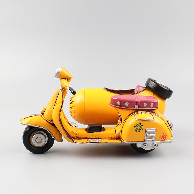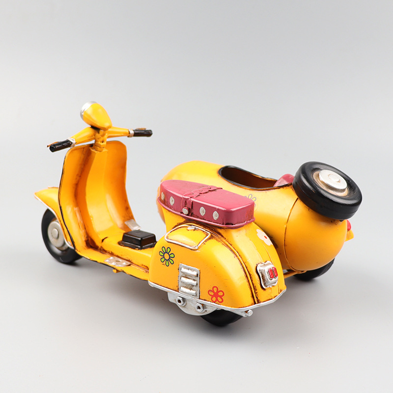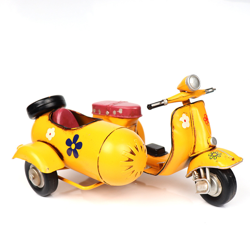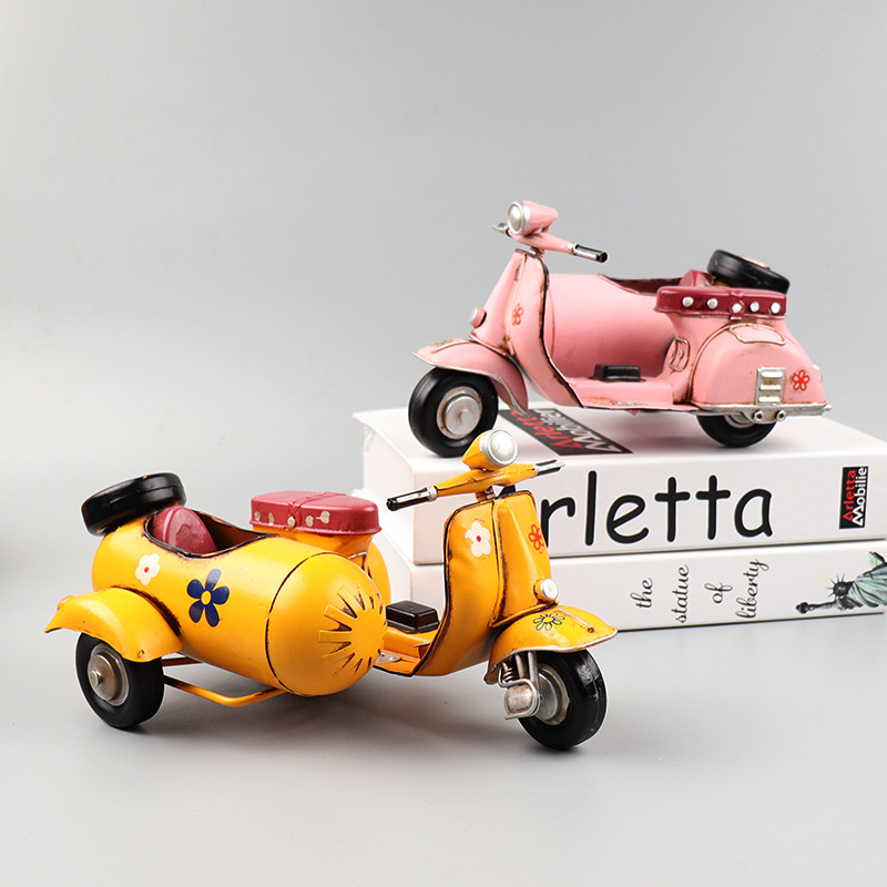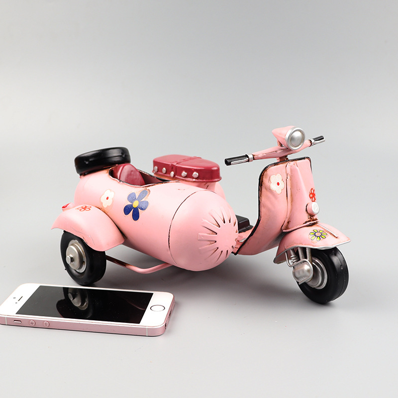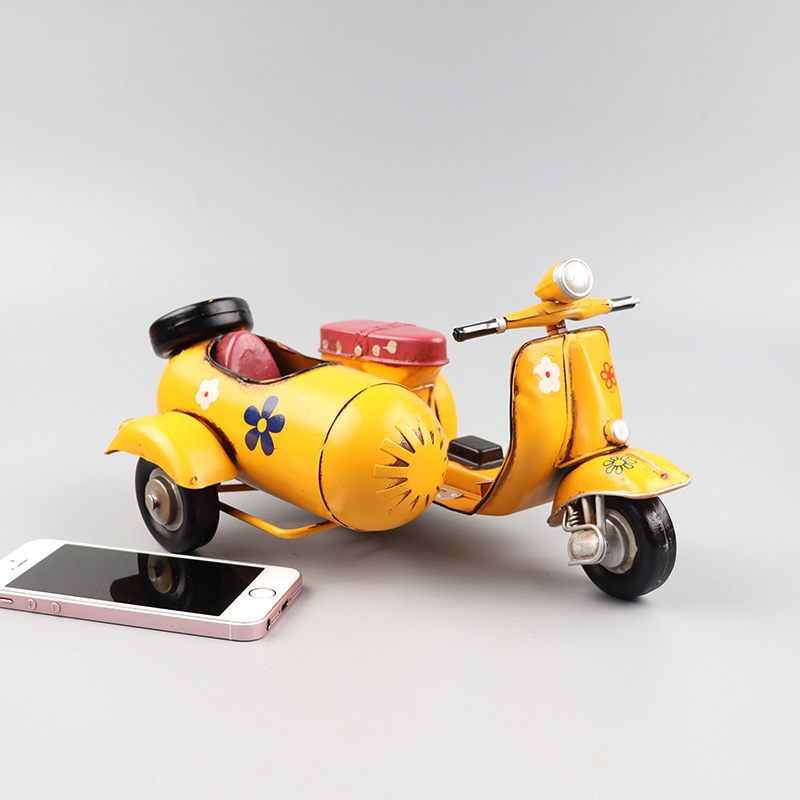 VESPA三轮摩托车模型铁皮挎斗偏三轮小踏板创意手工艺品装饰摆件