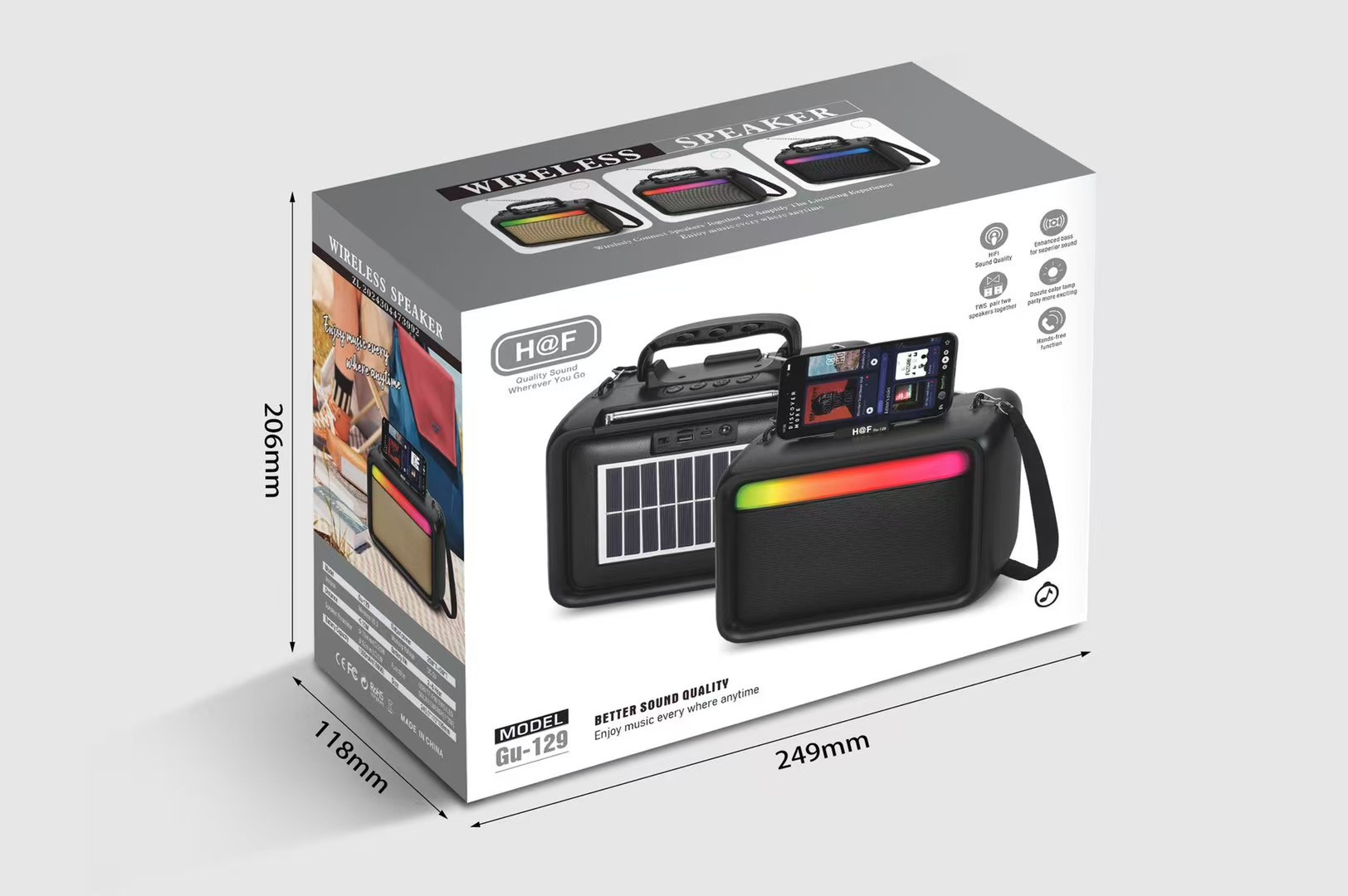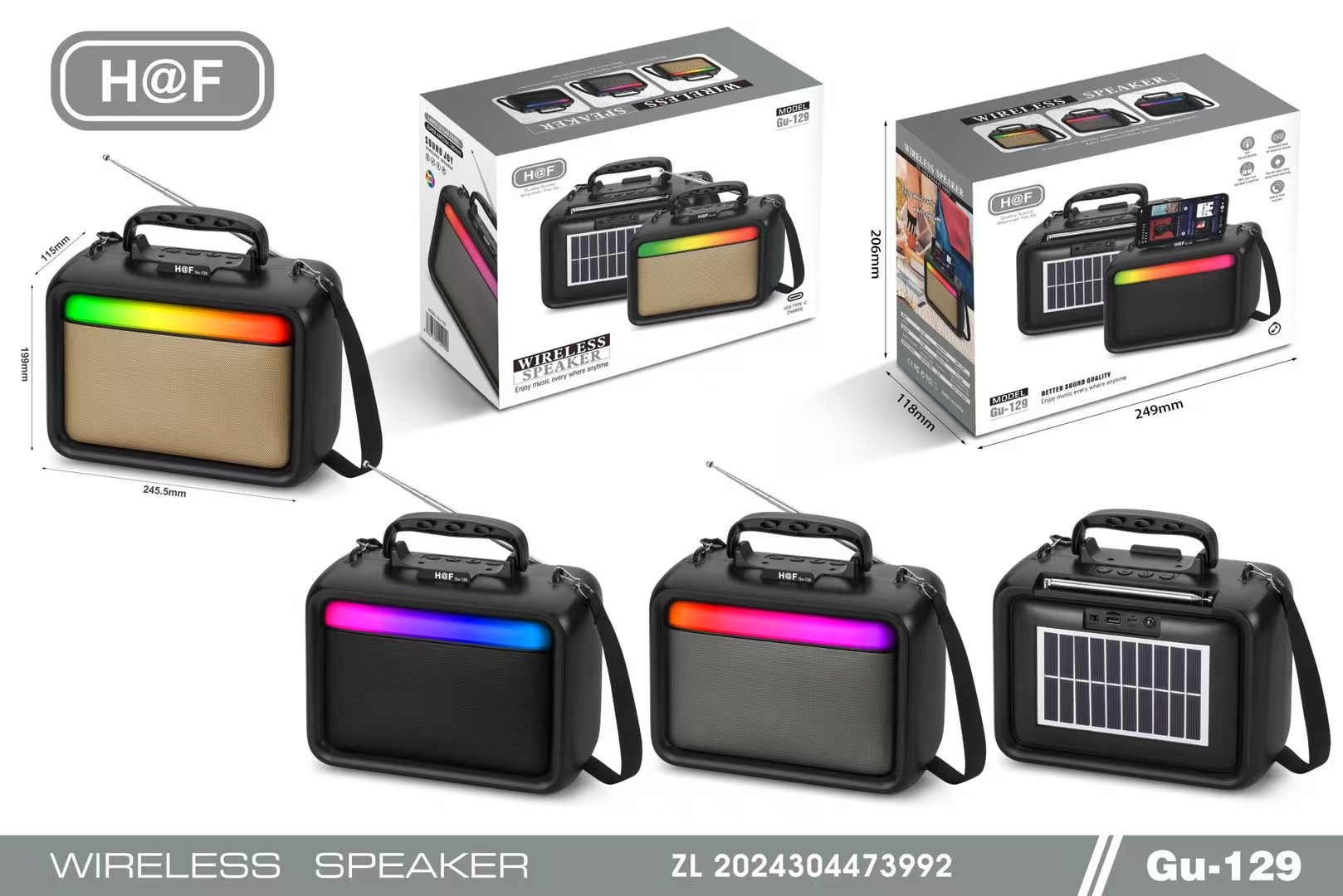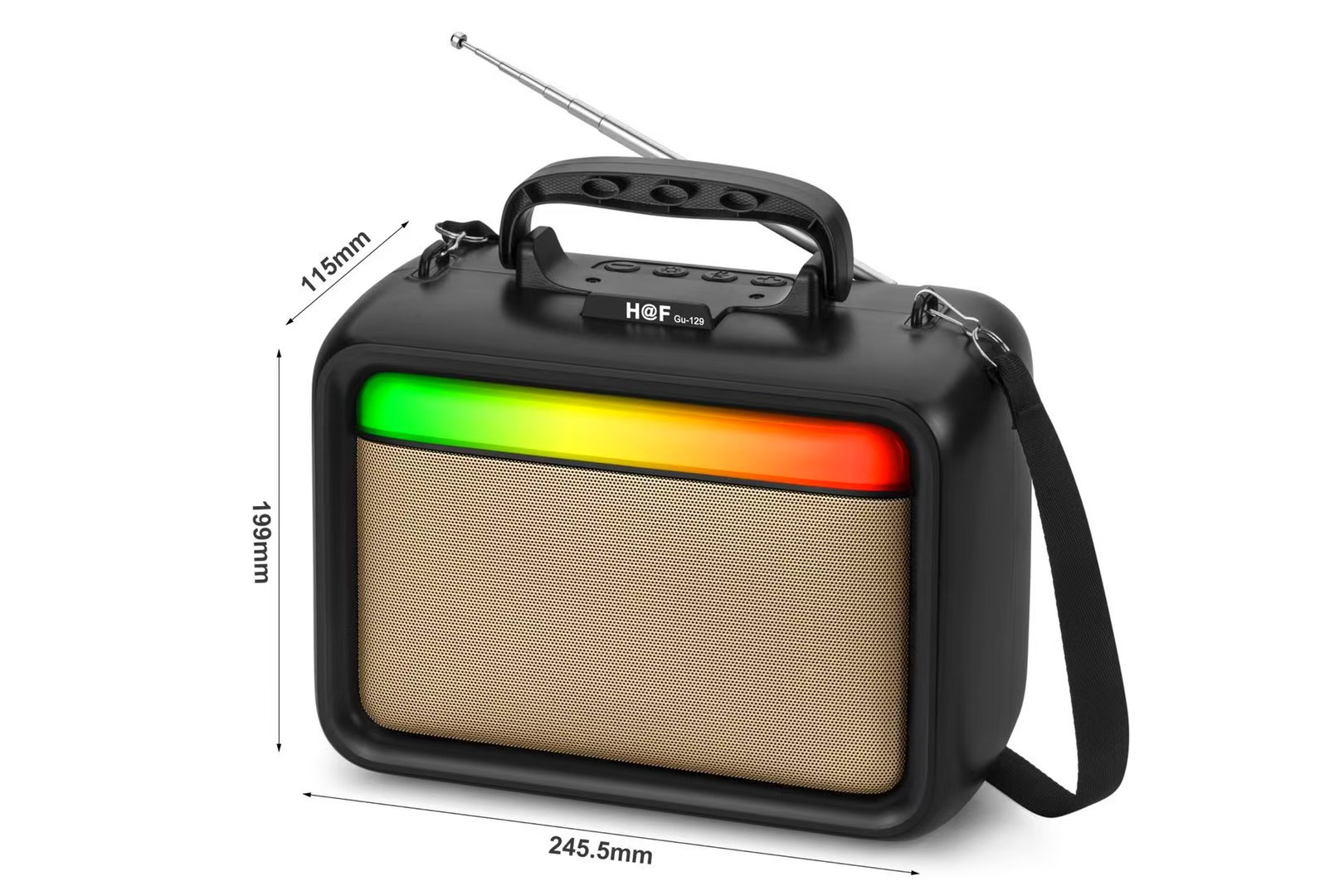 品牌: 中性 箱体材质: ABS 电源方式: 锂电池 防水等级: 不防水 外观尺寸: 245.5*115*199MM 内置蓄电池容量: 1200mAh-2000mAh(含) 连接方式: 蓝牙连接 是否内置电池: 内置电池 适用场景: 车载,桌面,健身运动,户外,居家,移动便 上市时间: 2025 频响范围: 100HZ-20KHZ 信噪比: ≥70db 喇叭数: 1 有效距离: 10 售后服务: 店铺三包 货号: GU-129 颜色: 黑色/金色/灰色 规格: 下单备注颜色 是否外贸: 是(本商品仅供外贸用途,可能不符合境内产 主要下游平台: ebay,亚马逊,wish,速卖通,独立