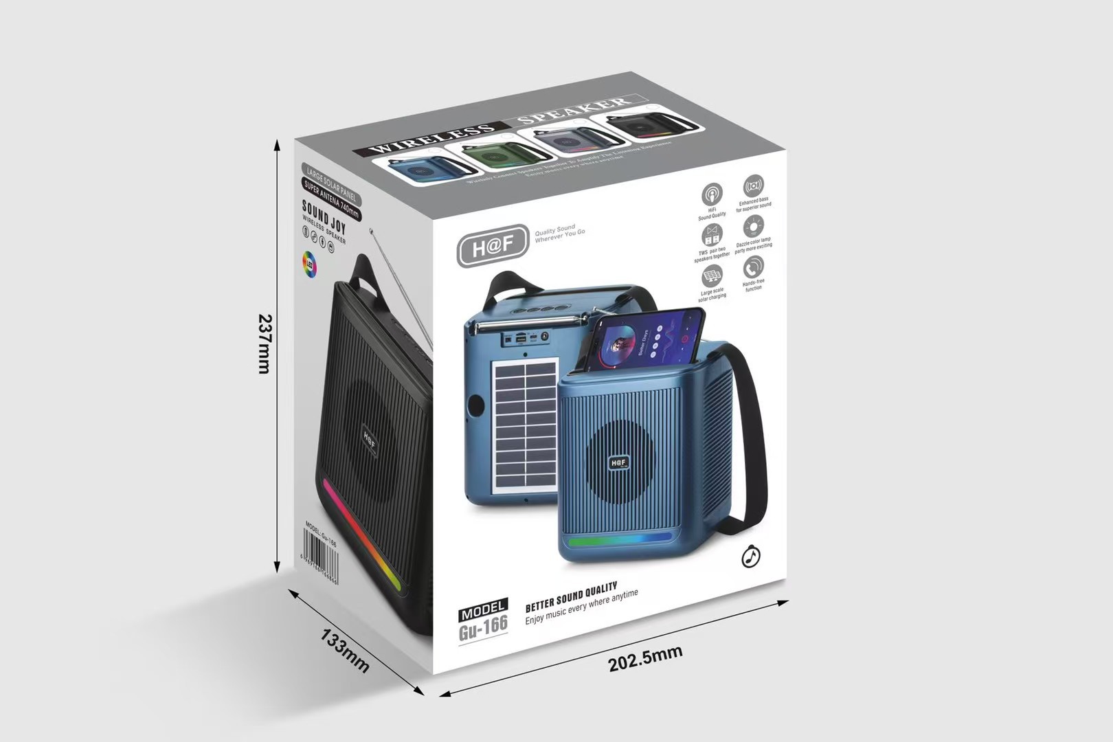 新品Gu-166非洲南美热销无线太阳能板蓝牙音箱低音炮收音机RGB灯 English | 投诉