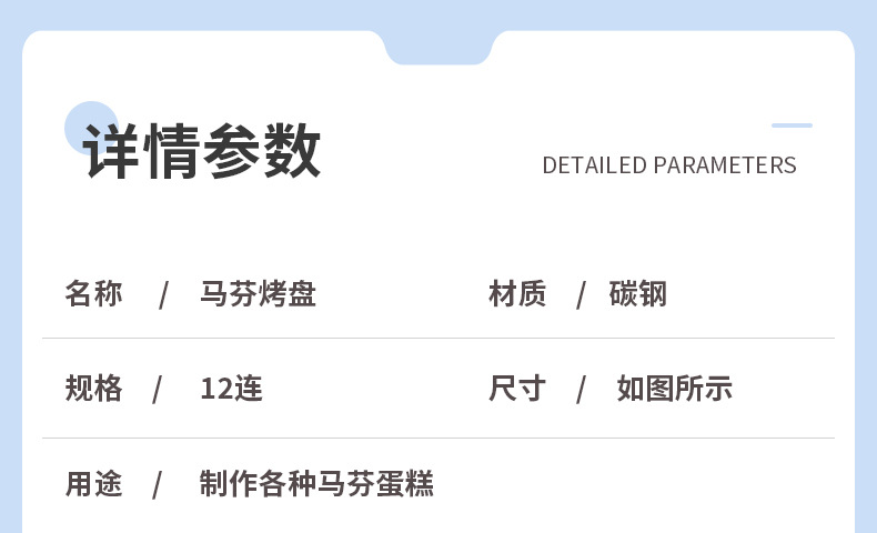 品牌: 莉莱 材质: 碳钢 风格: 现代简约 货号: 019 是否进口: 否 产品上市时间: 2025 产地: 永康 规格: 12连银色烤盘 主要下游平台: ebay,亚马逊,wish,速卖通,独立 主要销售地区: 非洲,南美,东南亚,北美,东北亚,中东, 有可授权的自有品牌: 是 是否跨境出口专供货源: 是 是否有专利: 否 图案: 椭圆形 盘类型: 甜品盘