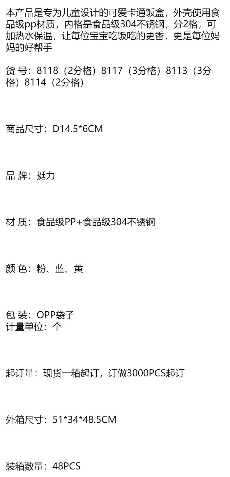 材质: 不锈钢 容量: 301-500ML 是否保温: 否 盒子层数: 单层 功能: 保温 品牌: 挺力 产品类别: 饭盒 是否进口: 否 货号: 8117 8118 形状: 圆形 微波炉: 不可用 风格: 可爱风 图案: 卡通 适用人群: 儿童 贸易属性: 内贸 箱装数量: 48 适用送礼场合: 生日,展销会,广告促销 加印LOGO: 可以 加工定制: 是 产品上市时间: 2017年春