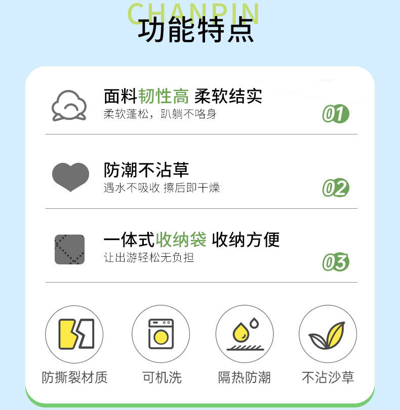 防潮垫种类: 防滑防潮垫 运动户外项目: 露营,户外,野炊,徒步旅行 材质: 涤纶(聚酯纤维) 适用人数: 8人以上,6-8人(含),4-6人(含) 尺寸: 200 面料: 春亚纺 颜色: 150*200CM(甜仔聚会兰)防潮隔冷 专利类型: 无 外贸出口认证: 无