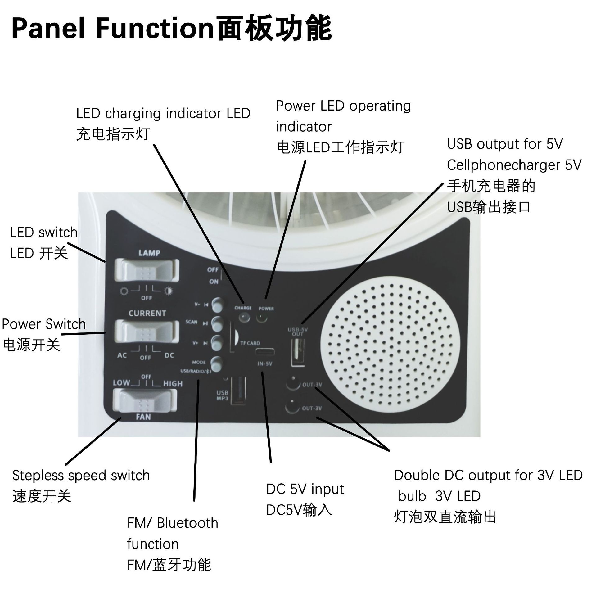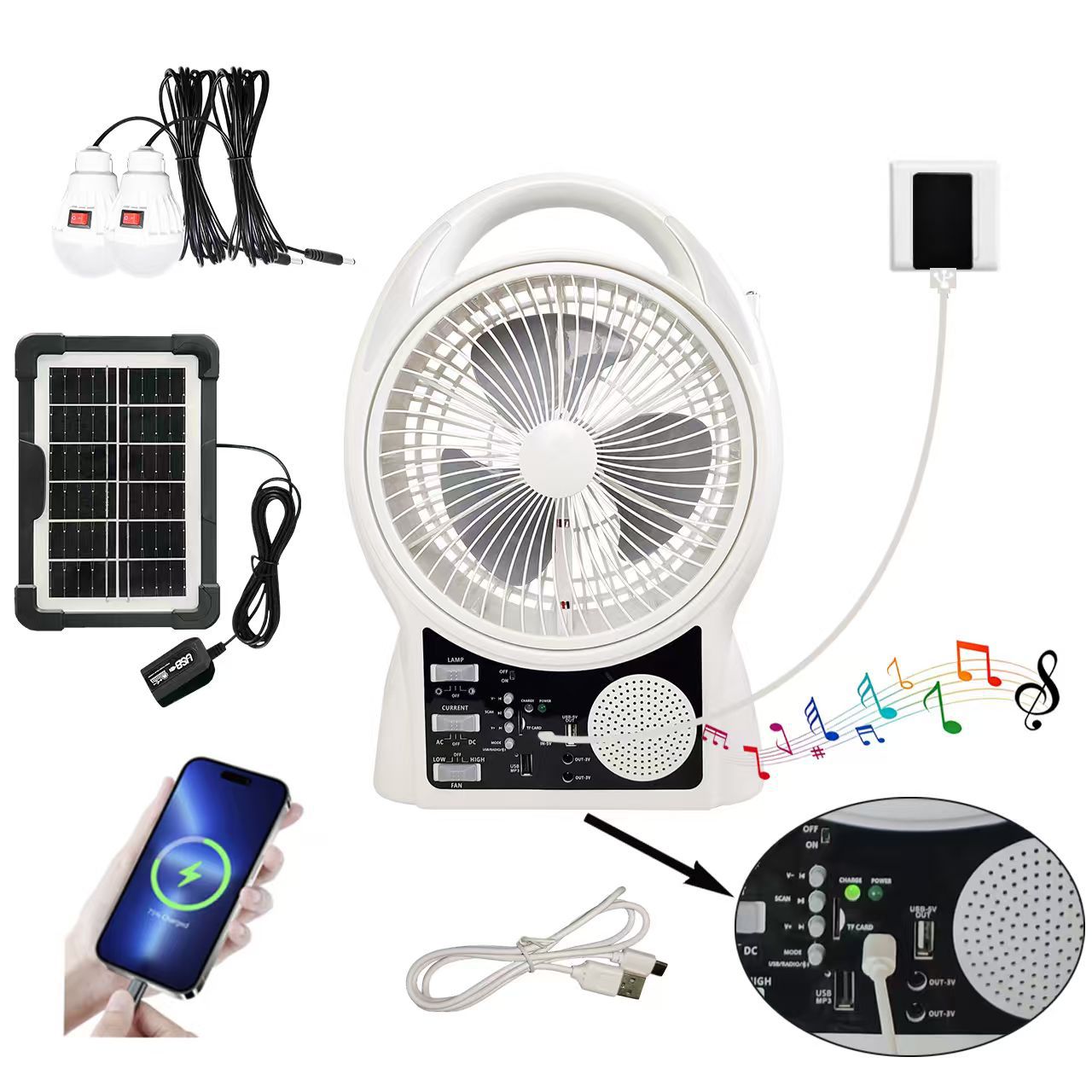 多功能台扇 带MP3 FM收音 蓝牙播放音乐 LED照明 手机充电 太阳能风扇