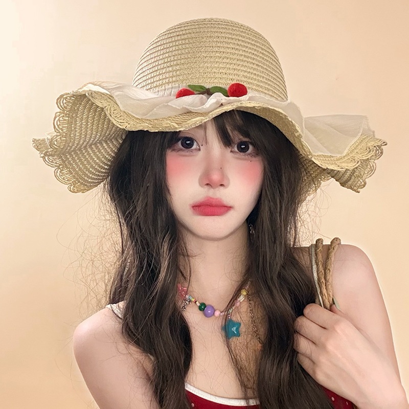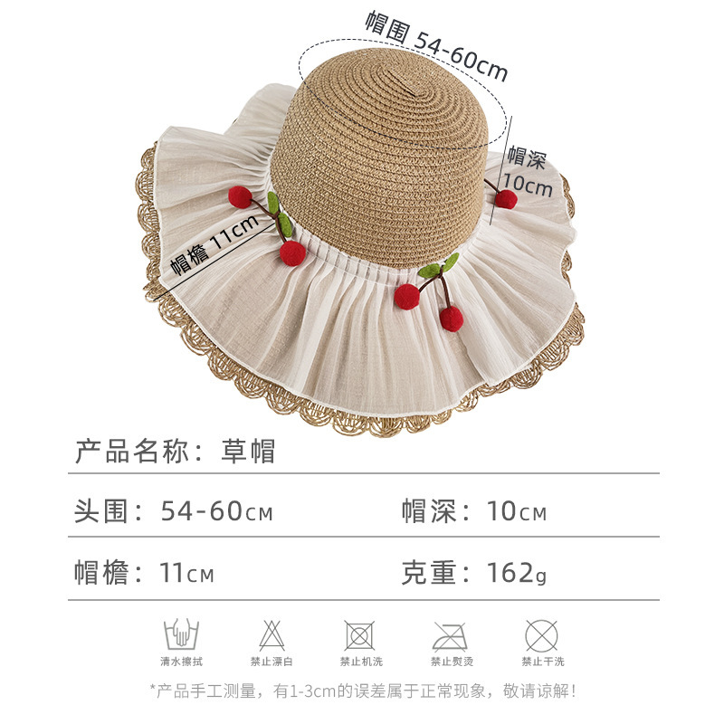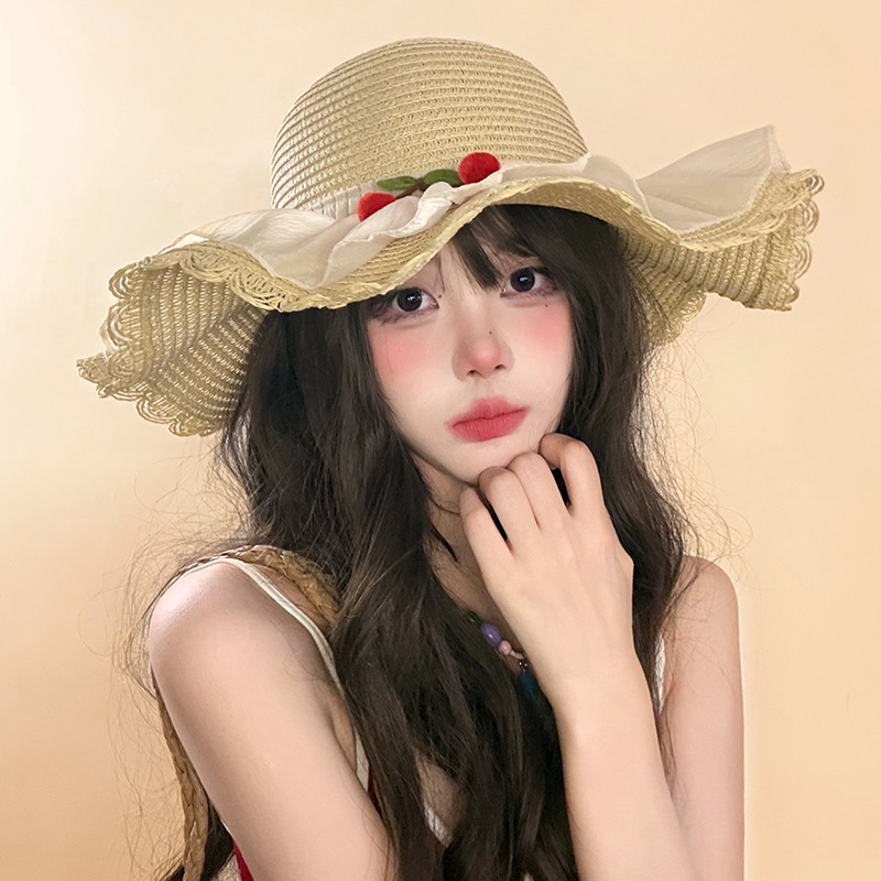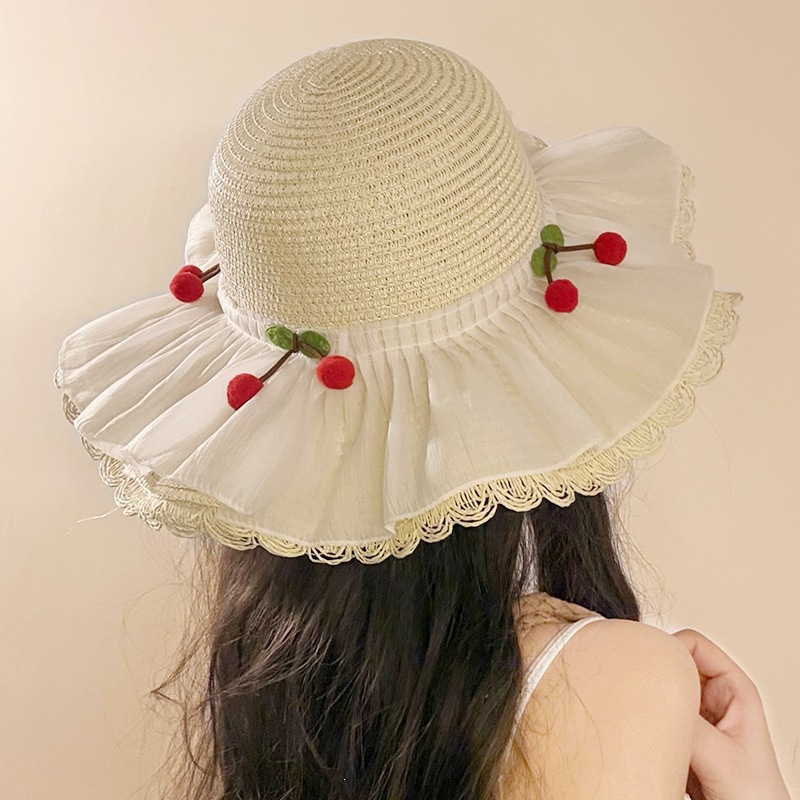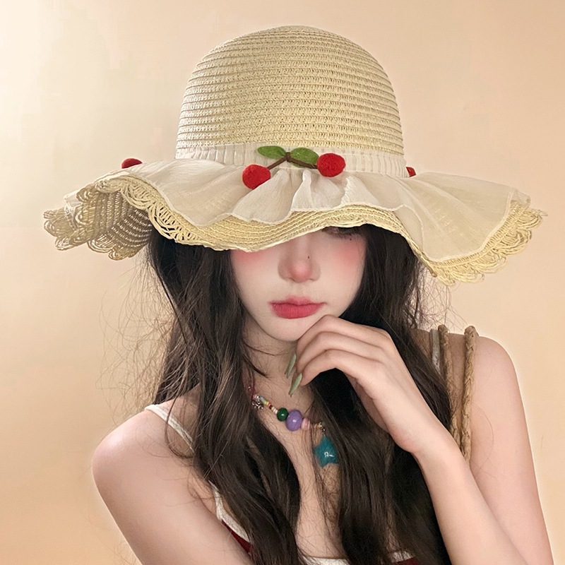 甜美森系樱桃蕾丝大檐草帽女夏季遮阳防紫外渔夫帽出游度假沙滩帽 English | 投诉