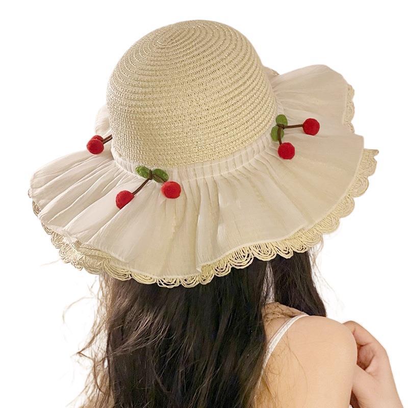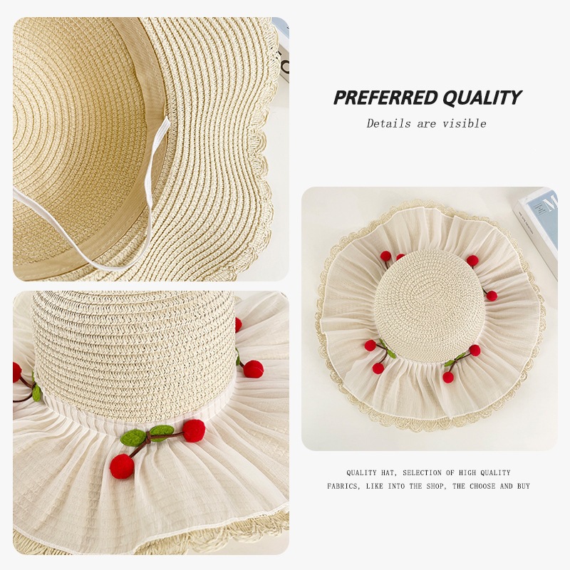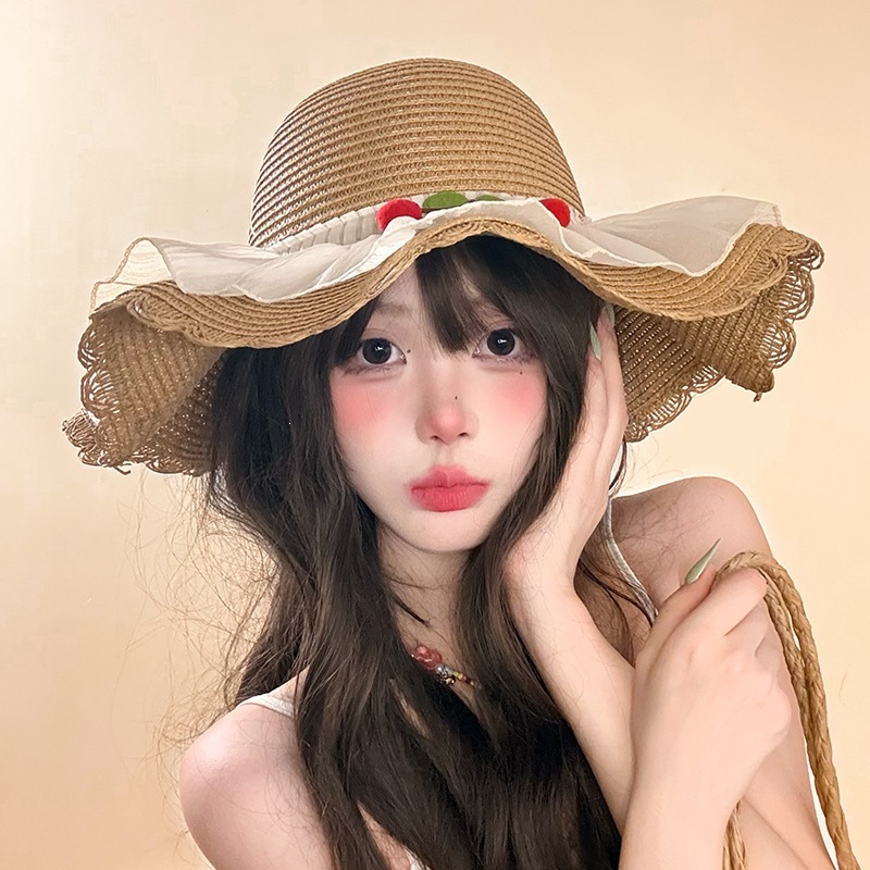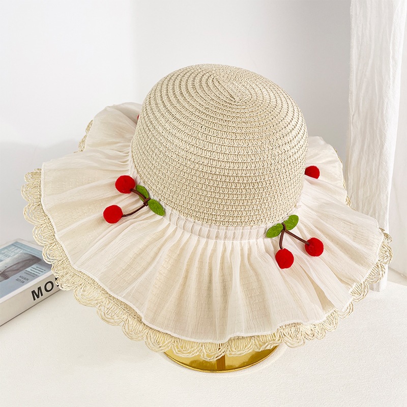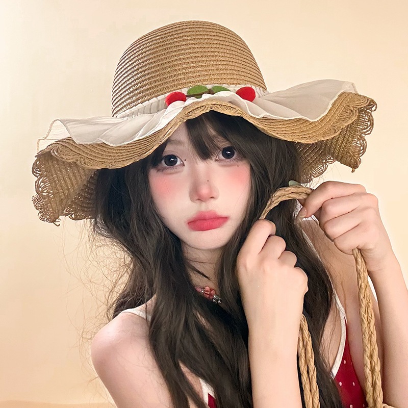 甜美森系樱桃蕾丝大檐草帽女夏季遮阳防紫外渔夫帽出游度假沙滩帽 English | 投诉