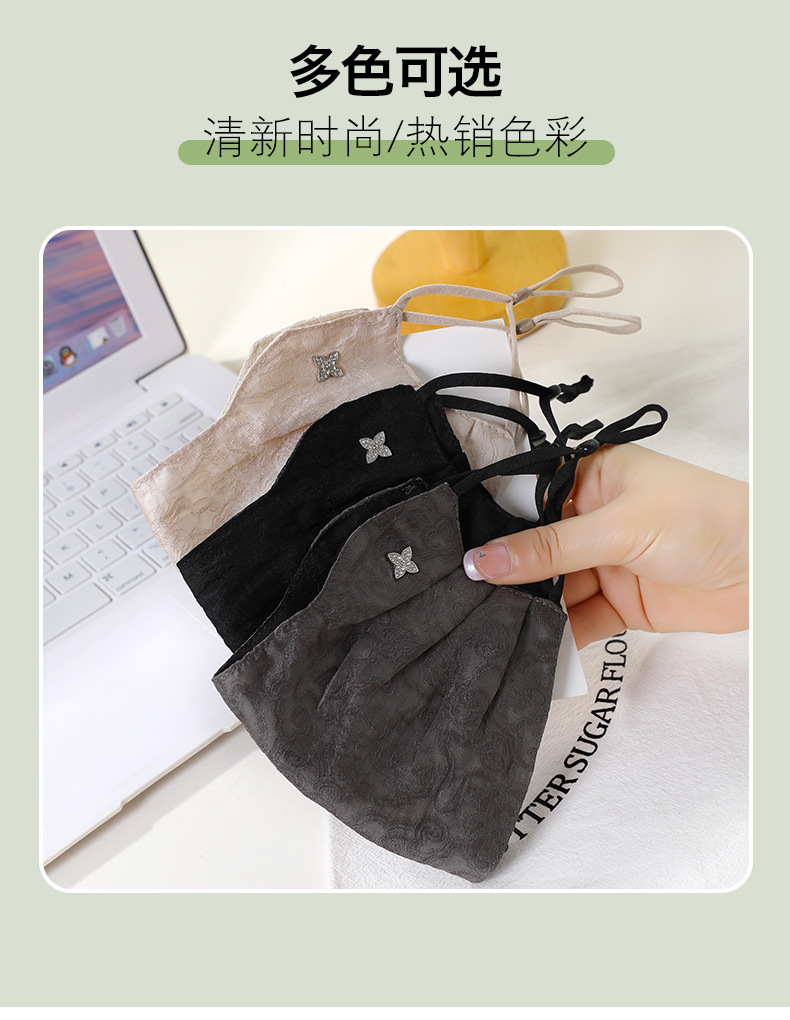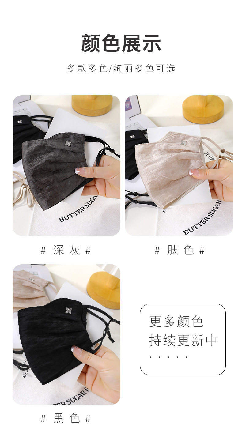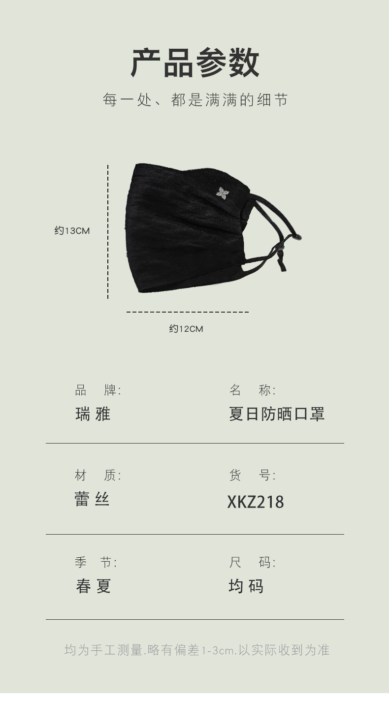 材质: 蕾丝 口罩款式: 挂耳式 功能: 防晒 品牌: 瑞雅 适用性别: 女 图案: 花卉 加工方式: 绣花 加印LOGO: 可以 适合季节: 冬季,秋季 适用送礼场合: 节日 加工定制: 是 货号: XKZ218 产地: 金华 主要下游平台: 淘宝,京东,快手,天猫,拼多多 主要销售地区: 南美,北美,东北亚,中东 有可授权的自有品牌: 是 是否跨境出口专供货源: 是 尺码: 均码 上市年份/季节: 2026年春季 风格: 甜美 重量: 0.04 kg/个