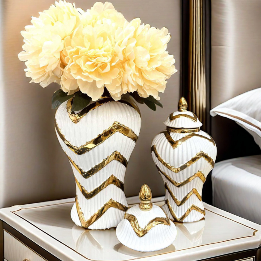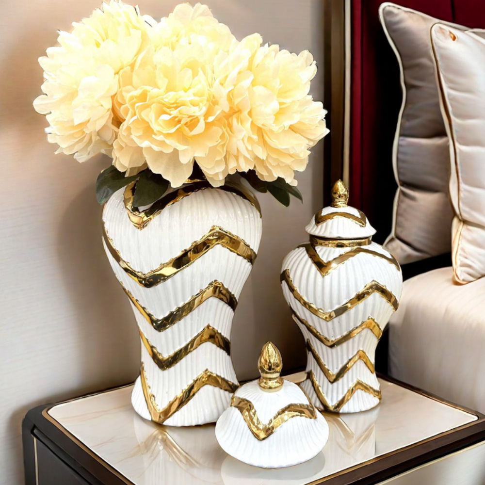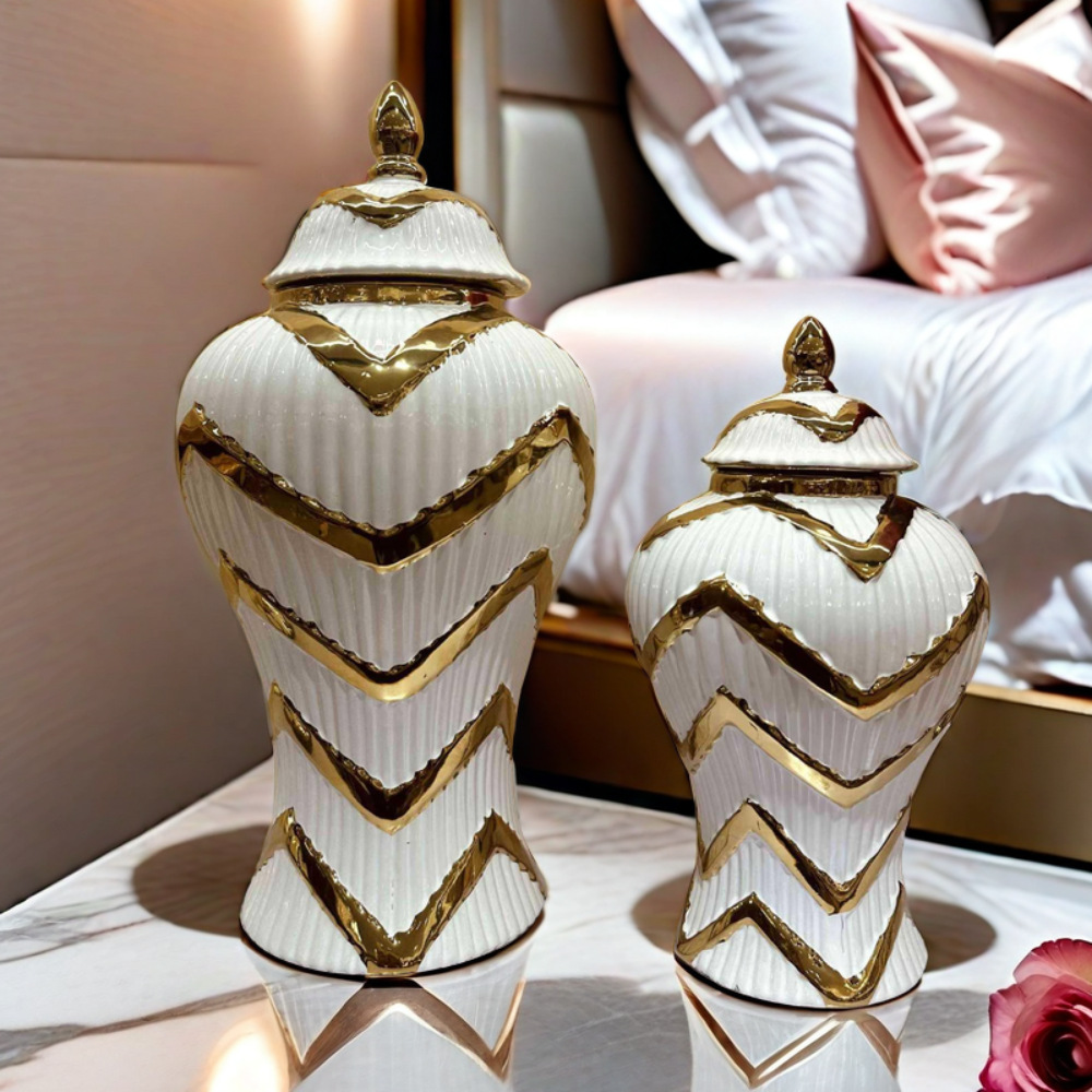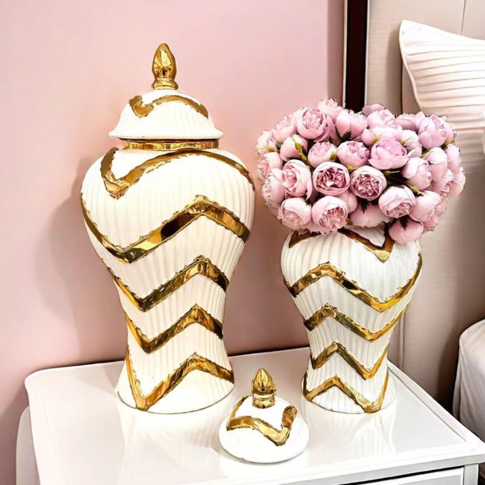 出口玄关摆件欧式电镀金色陶瓷将军罐花瓶摆件轻奢工艺样板房软装
