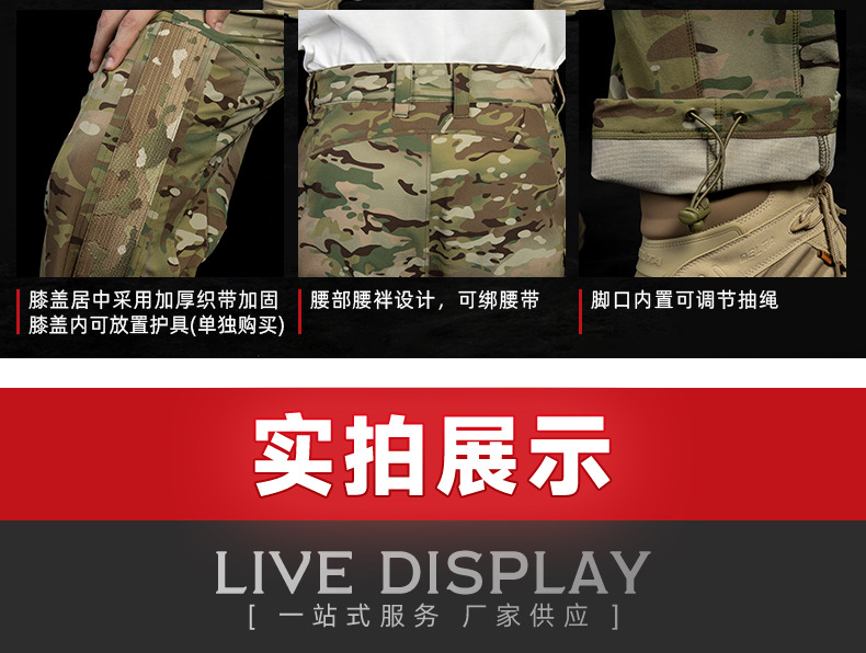 功能: 透气 产品类别: 作训服 面料: 长城条登山布+防泼水 适合季节: 春季,秋季 适用性别: 中性/男女均可 图案: 迷彩 适用年龄段: 成年 适用场景: 徒步登山野营