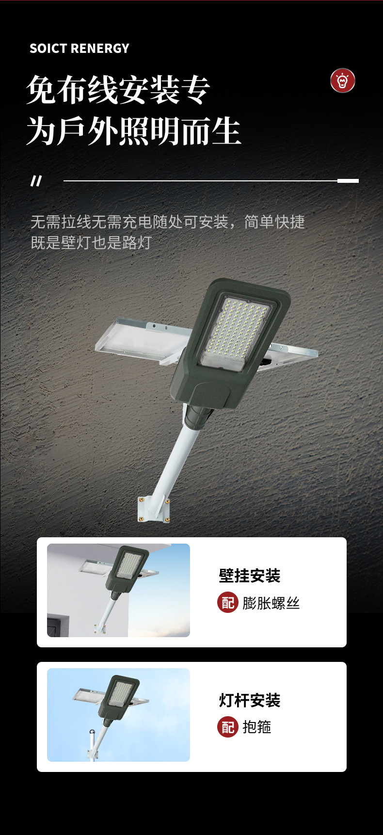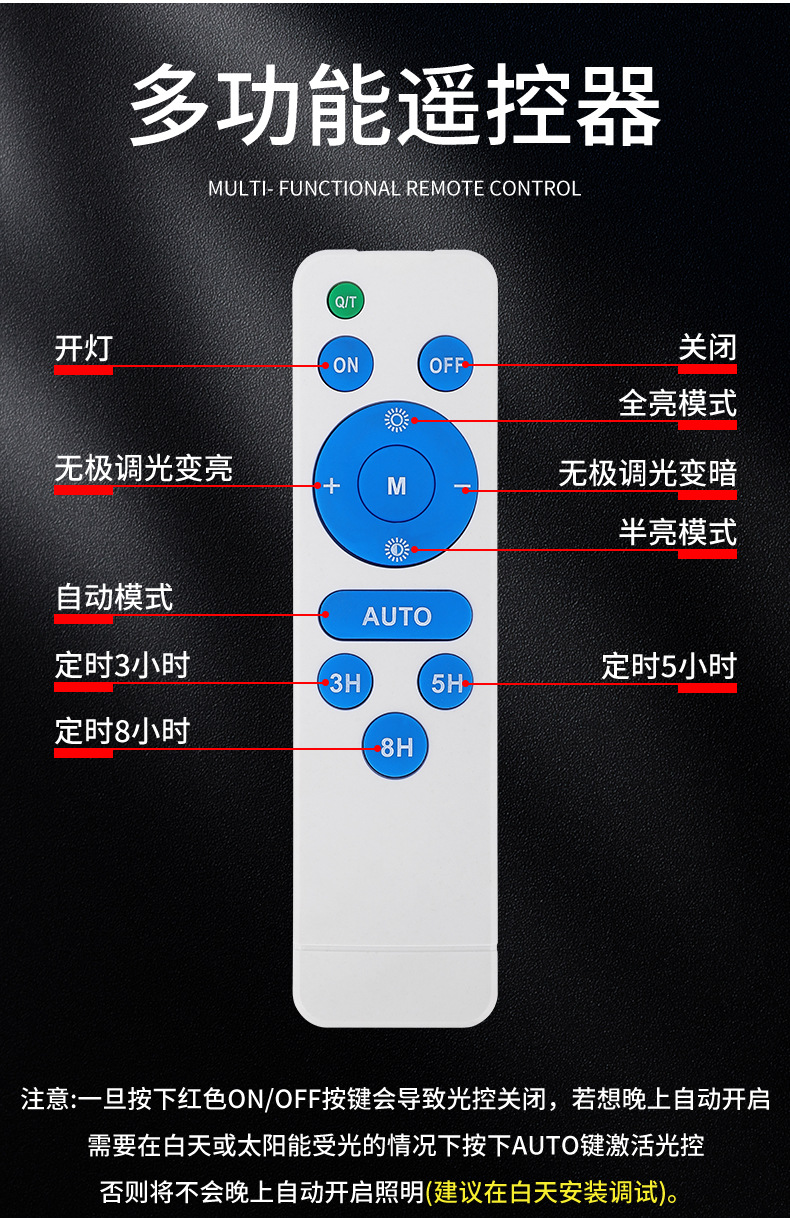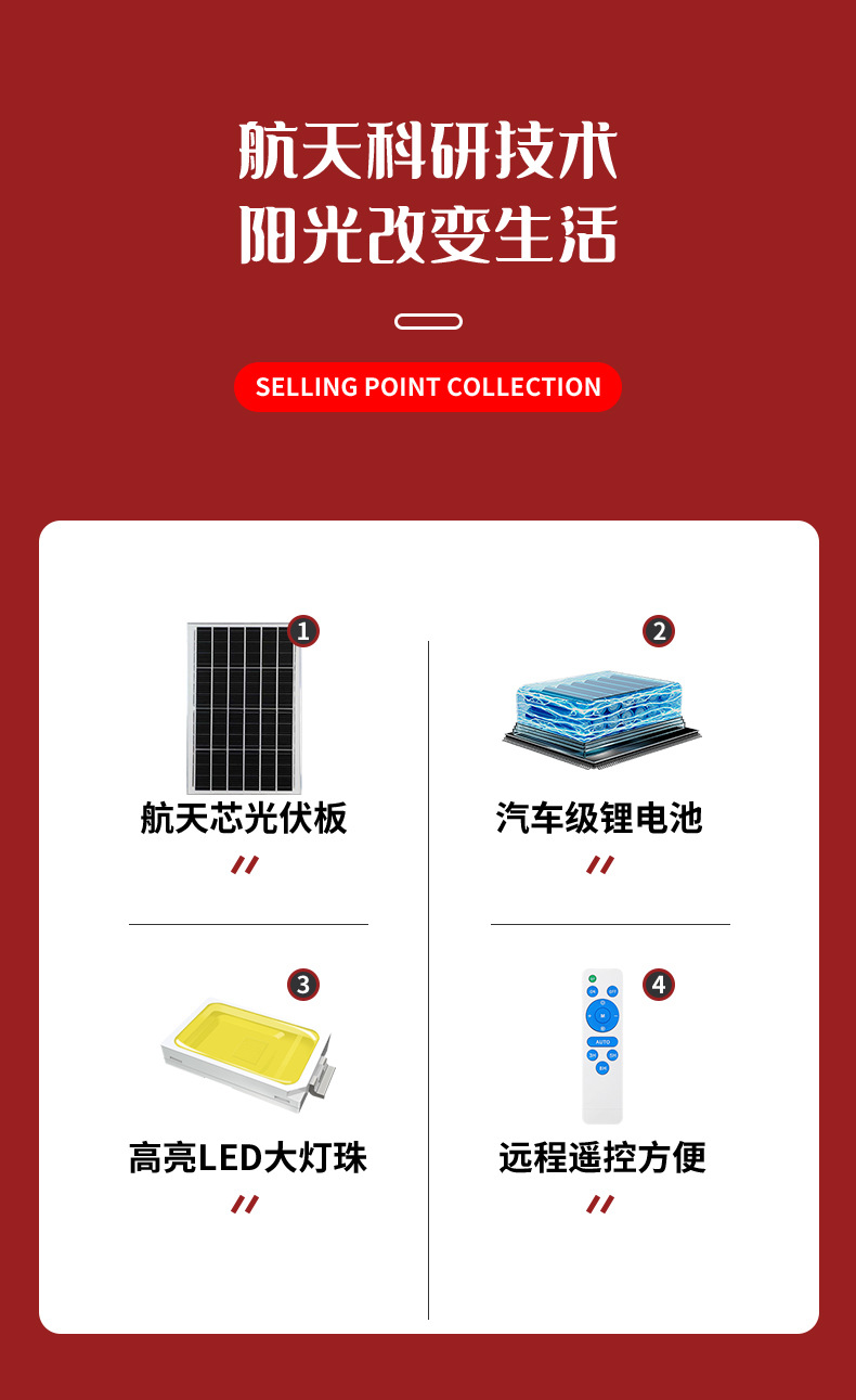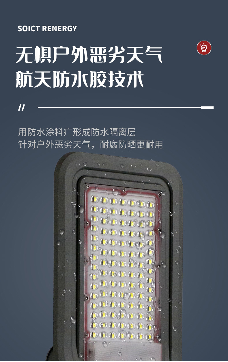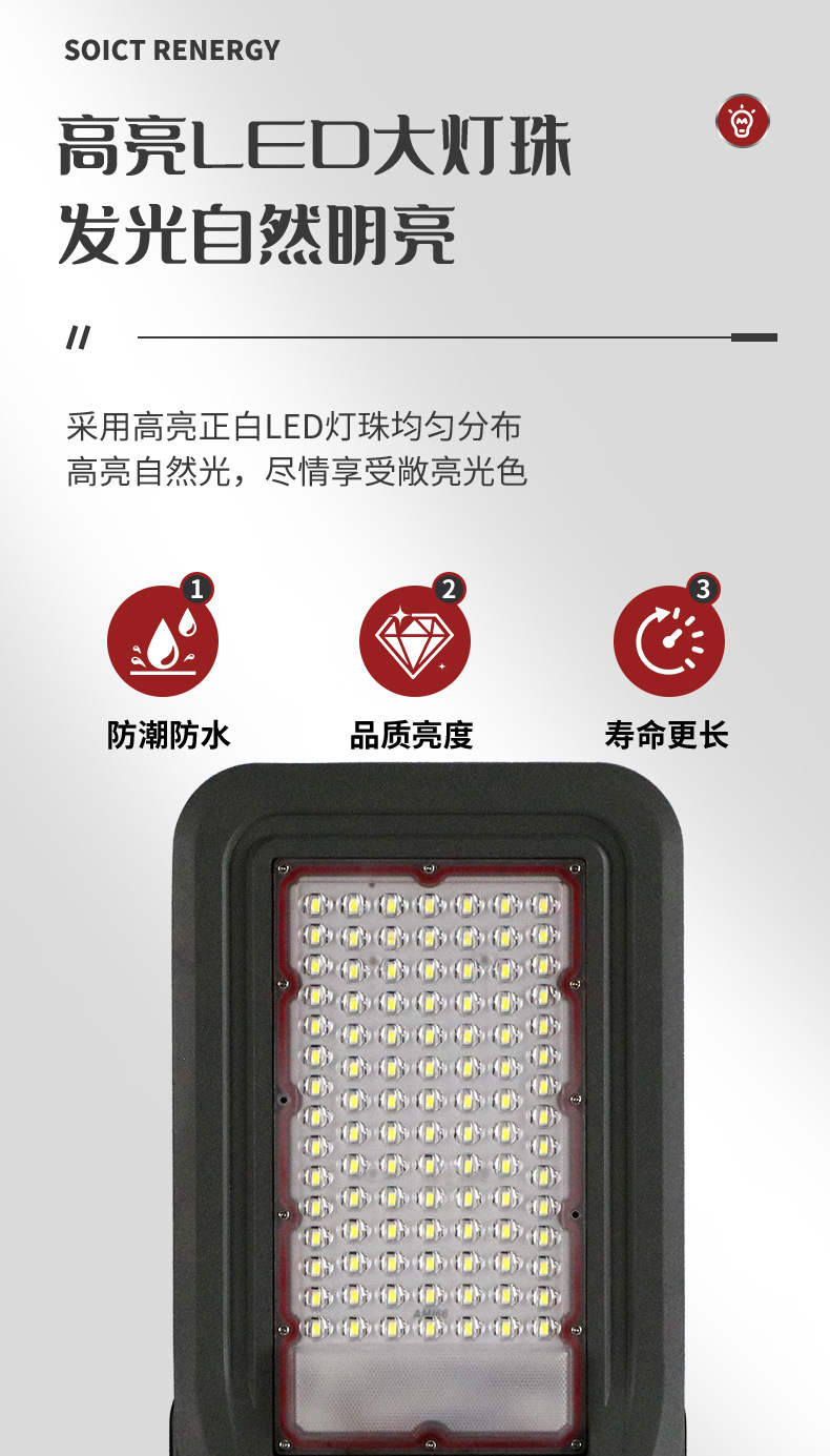 防护等级: IP67 开关类型: 感应式 光源类型: LED光源 连续照明时间: 24小时(含)-36小时(不含) 外形尺寸: 535mm*205mm*85mm 额定功率: 60W 规格分类: 整体压铸铝灯体/大容量电池 主要销售地区: 欧洲,南美,东南亚,北美,东北亚,中东