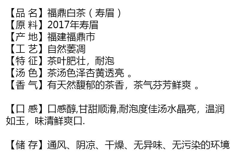 产品类别: 寿眉 品牌: 馥兰汀 级别: 二级 是否礼盒装: 否 原料与配料: 福鼎大白茶青 净含量(规格): 350 售卖方式: 包装 保质期: 99 是否进口: 否 原产地: 福建 生产日期: 2017年04月20日 生产厂家: 福建宁德馥汀兰茶业有限公司 储藏方法: 常温 生产许可证编号: SC11435098102038 货号: 古树白茶 适用场景: 商用 产品认证: 否 重量: 0.302 kg/个
