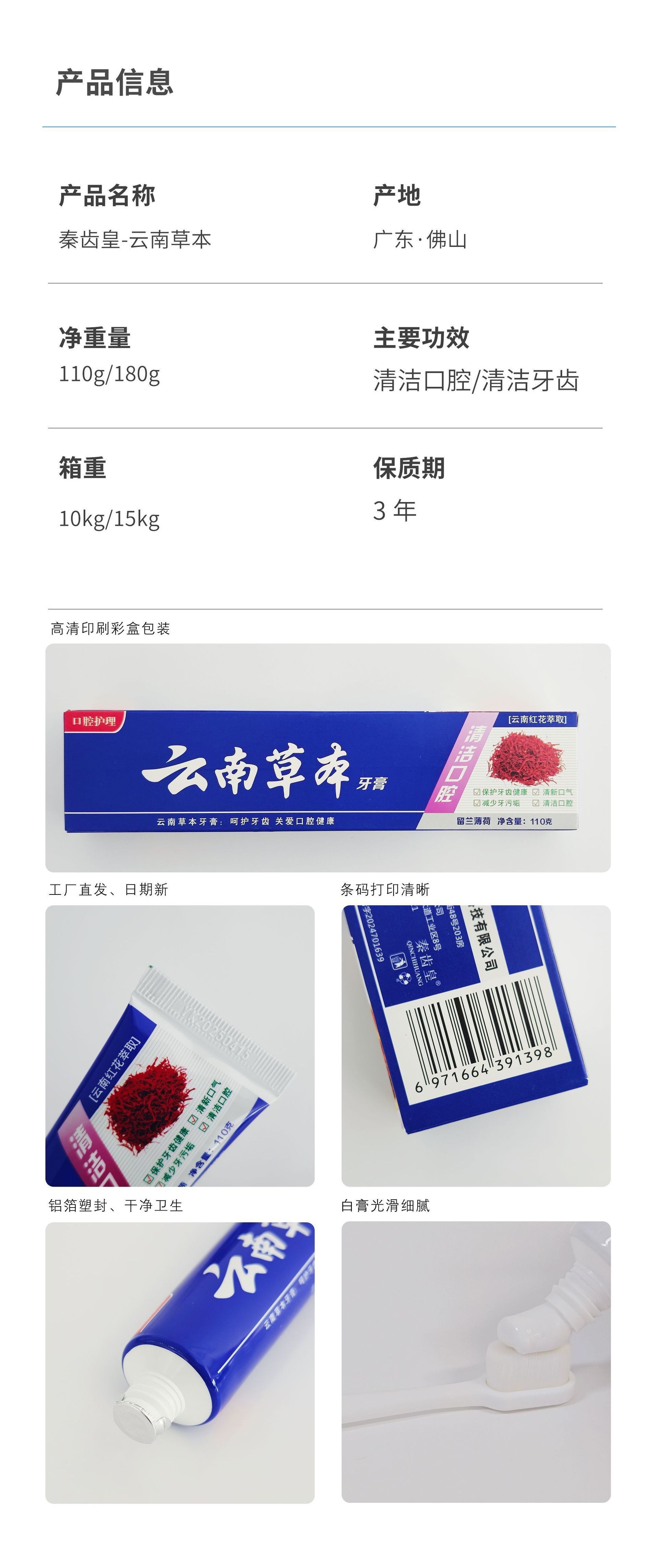 品牌: 秦齿皇 功效: 牙周护理 品牌类型: 国货品牌 净含量: 110g 香型: 薄荷 是否进口: 否 功能: 清新口气 货号: 秦齿皇-云南草本-110g 适用对象: 通用 产地: 广州 箱装数量: 72支/箱 保质期: 3年 规格类型: 支 是否含氟: 否 是否量贩装: 是 是否跨境出口专供货源: 否 型号: 秦齿皇-云南草本-110g 规格: 72支/箱 备案: 粤国牙膏网备字2025001023 重量: 0.116 kg/支