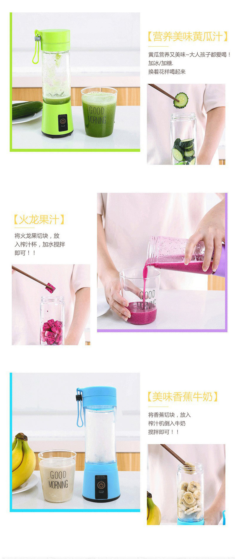 1.首次使用,请先充电3小时,果汁杯在充电过程中是不能使用的。