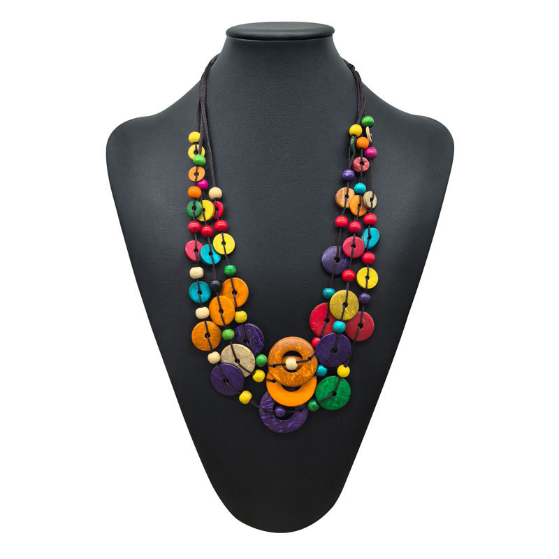 波西米亚民族风多层彩色圆形椰壳木珠复古时尚手工编织项链批发