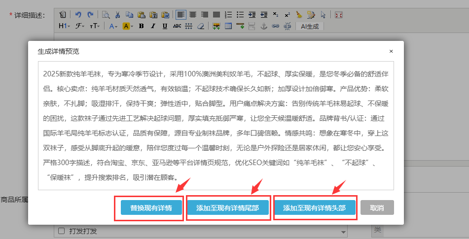 第三步:生成完成后,可以选择 “替换现有详情” 或者 “添加至现有详情尾部” 或者 “添加至现有详情头部”。