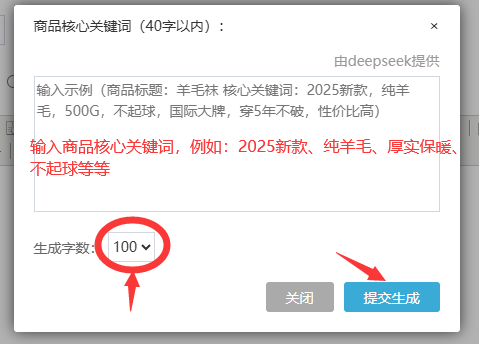 第二步:输入商品核心关键词、选择需要生成的字数再提交生成即可;