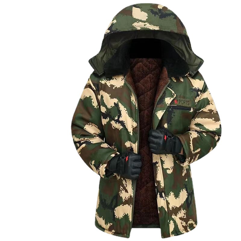 冬季迷彩加绒加厚棉衣三层保暖有冒三斗拉链款工作服冷酷登上地摊