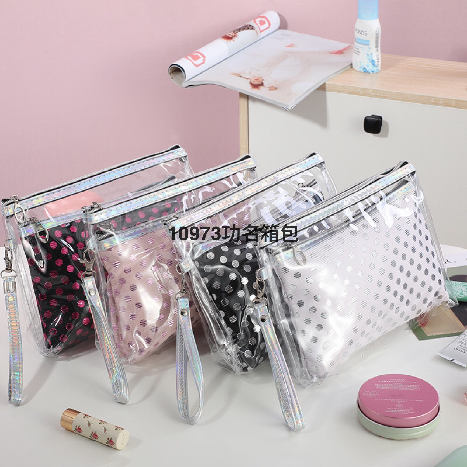新款简约小清新PU圆点洗漱包随身pvc化妆包拉链收纳包可定制厂家