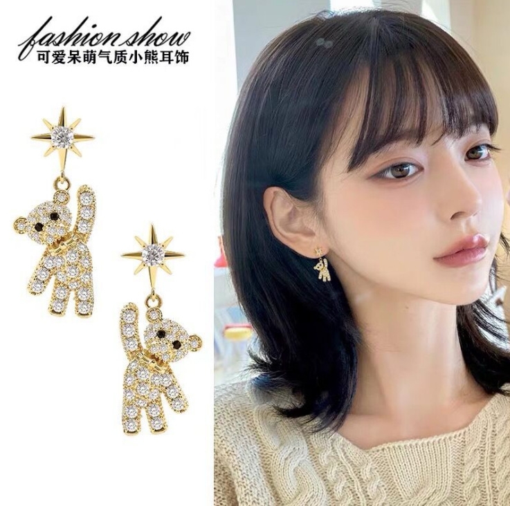 s925银针小熊满钻简约小巧耳环 韩国气质可爱甜美百搭设计感耳坠