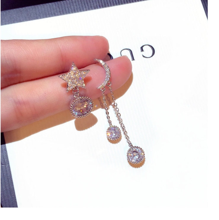 S925纯银针星星月亮耳钉女耳环不对称耳坠气质韩国个性网红耳饰