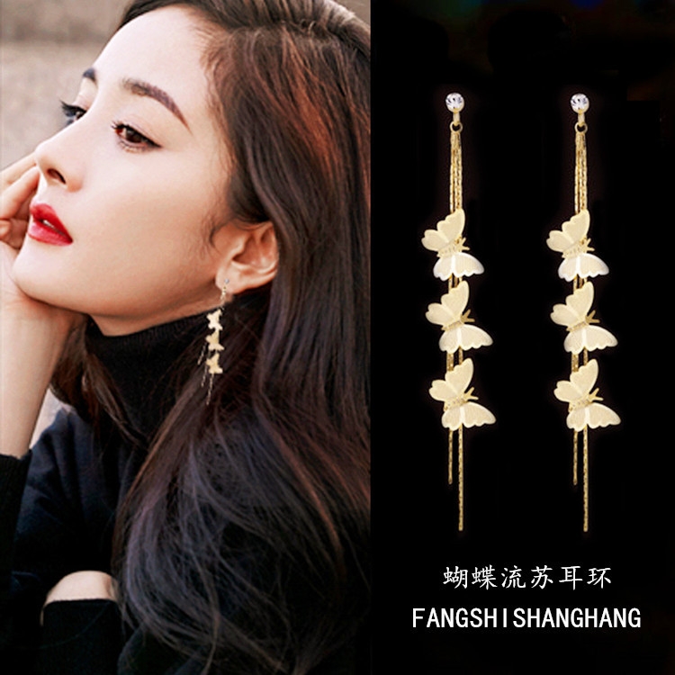 925银针超仙蝴蝶耳环长款流苏耳环女 韩国气质百搭显脸瘦蝴蝶耳饰