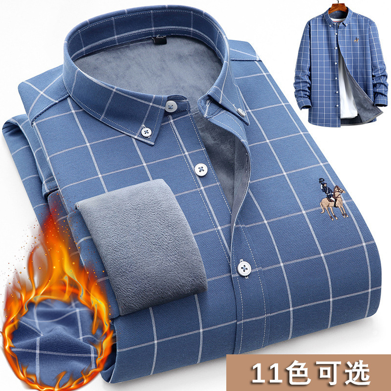 秋冬男士长袖衬衫免烫商务加绒加厚翻领衬衫男式修身保暖口袋衬衣