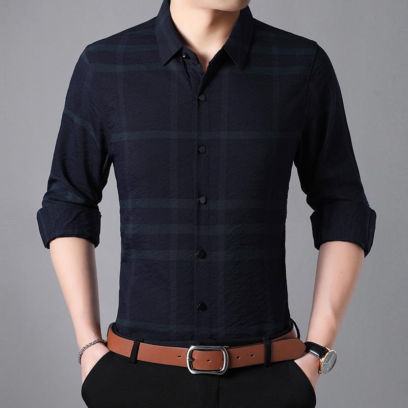 新款2020春秋季商务衬衫中年男士长袖格子开衫翻领男式衬衫爸爸装