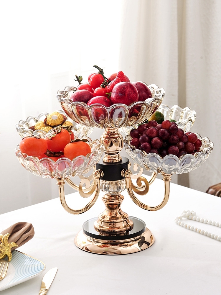 水晶玻璃果盘5头欧式大果盘别墅奢华装饰果盘干果盒底座金色果篮