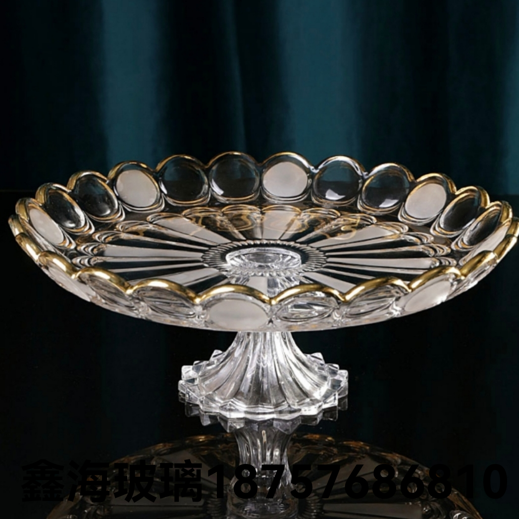 玻璃底座金色果盘 玻璃工艺品水果盘子 花边水晶果盘加厚玻璃盘