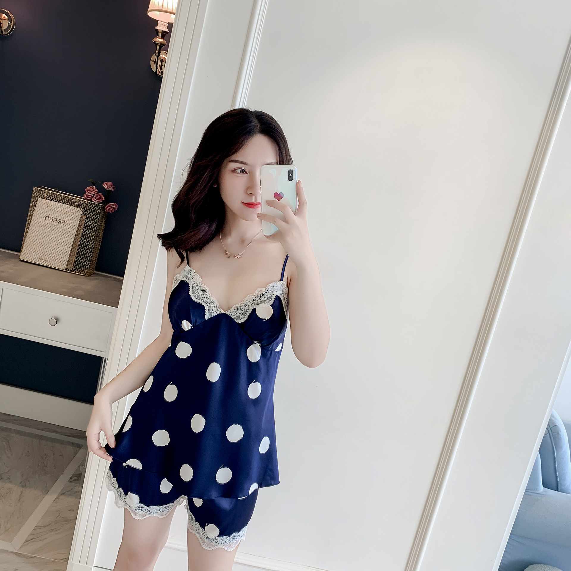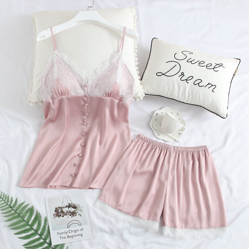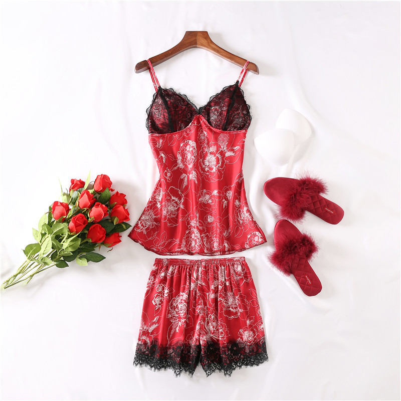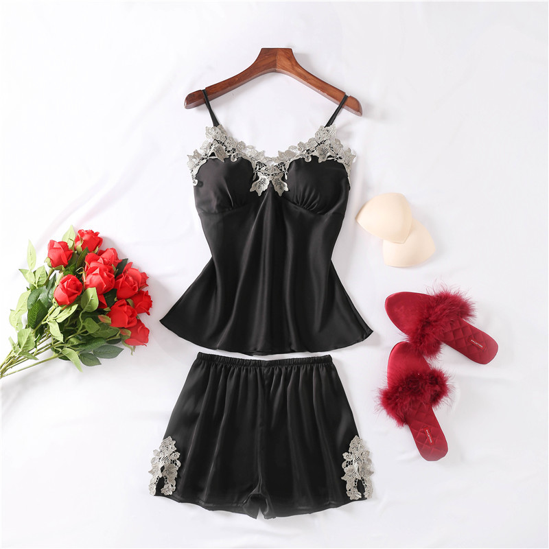 春夏新款仿真丝性感睡衣 女士花边吊带短裤两件套 少女可爱家居服